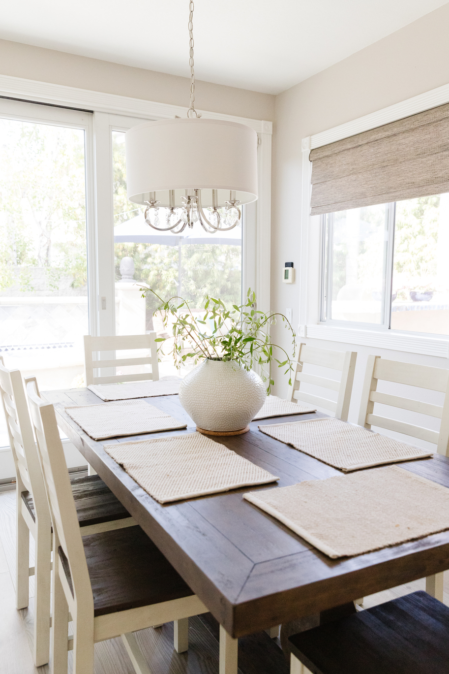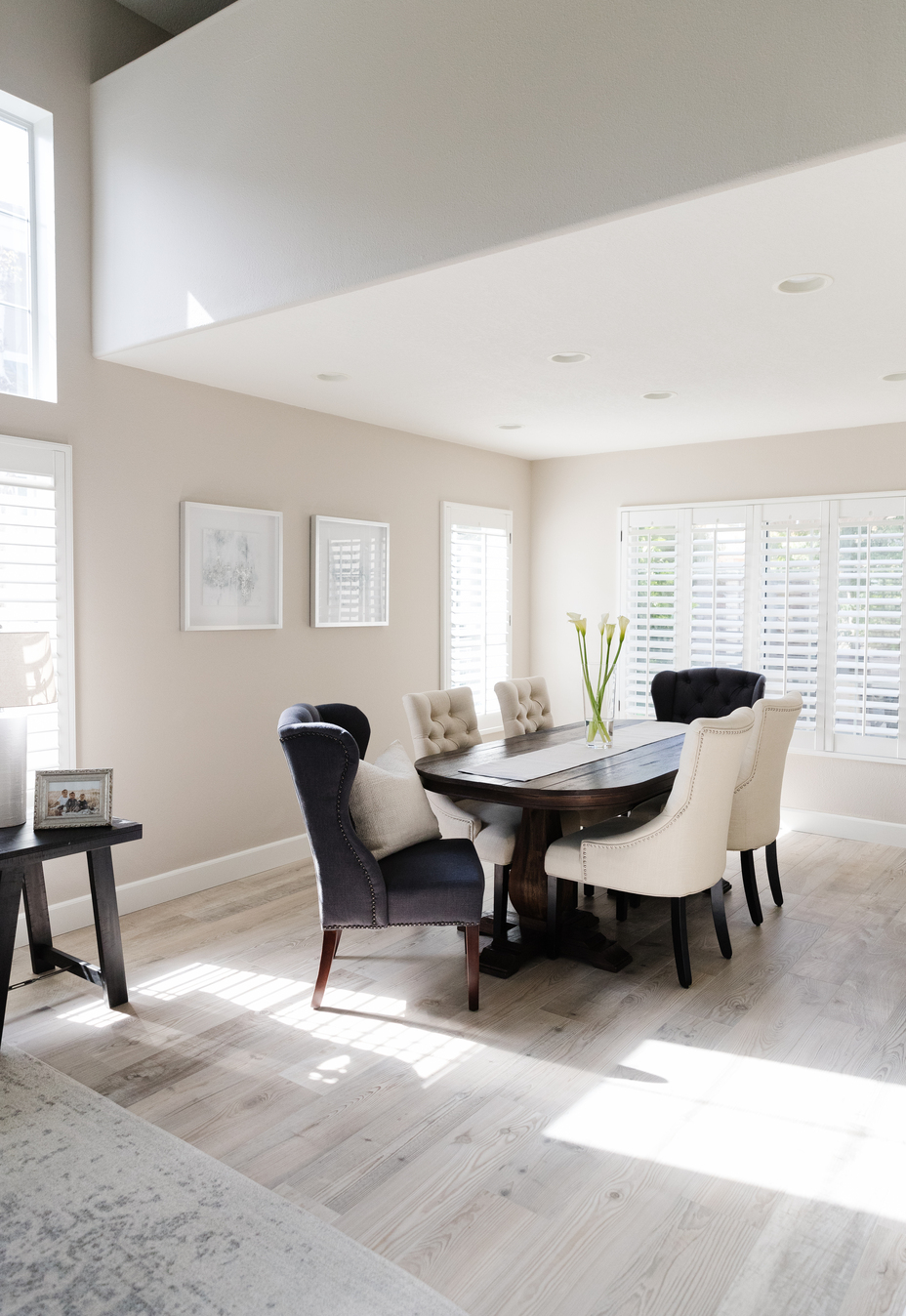 The dining area is equipped with an elegant table and comfortable chairs, creating an ideal spot for meals and gatherings. The use of soft, neutral tones in furniture, including the soothing grey and beige hues, creates an atmosphere of calmness.
