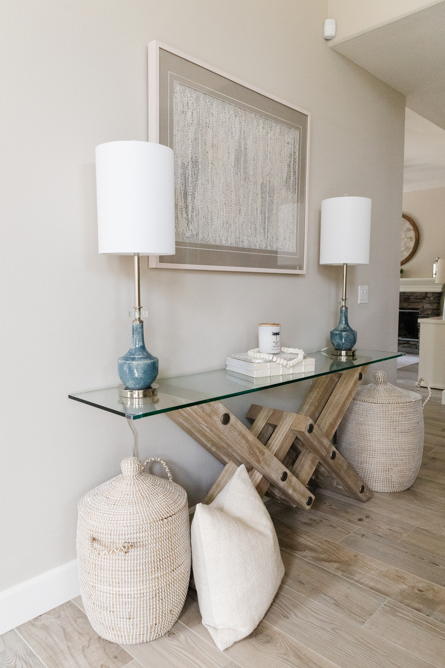 The entryway features a minimalist bench with plush pillows, paired with subtle artwork and modern lighting, setting the tone for the rest of the home. As you move into the living areas, you encounter a stylish, inviting space with carefully chosen furniture, such as cozy sofas adorned with decorative pillows, and a coffee table that adds texture and contrast to the room. The natural wood elements, such as the dining table and wooden accents, provide a grounded warmth that balances the sleek, clean lines.