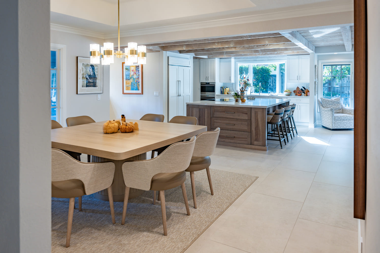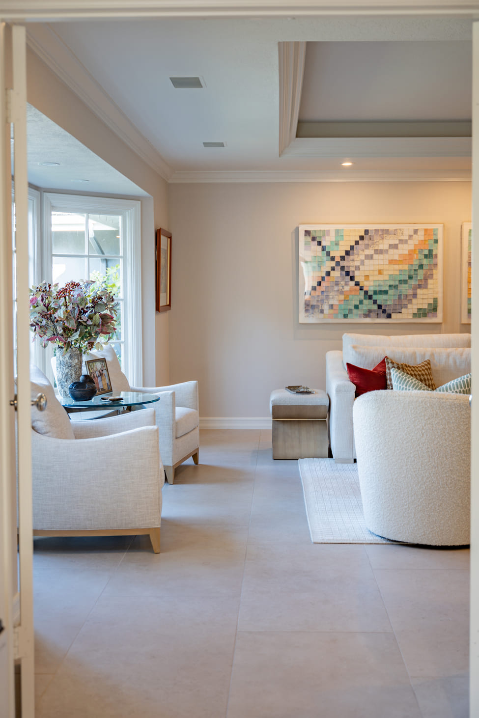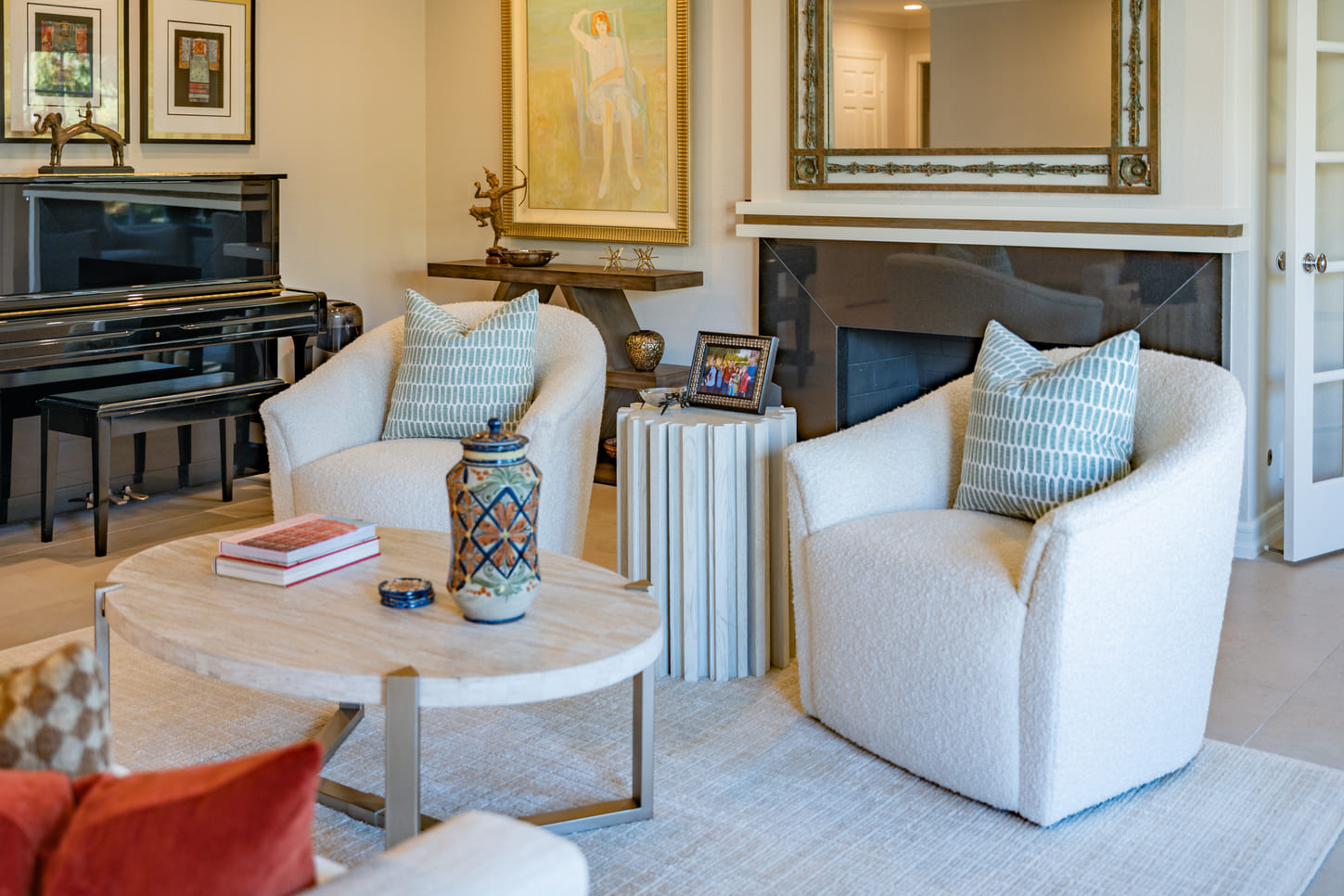 The focus on this furnishing project was to embody a serene palette of soft, neutral tones, that create an inviting and comfortable ambiance that encourages relaxation when gathering with friends and family. Each piece was thoughtfully designed to balance form and function, seamlessly integrating into modern living spaces. Vibrant art pieces adorn the walls, adding bursts of color and personality that enliven the room, while cozy accessories—such as plush throw pillows and textured blankets—infuse warmth and charm. This project celebrates the harmony between elegance and practicality, ensuring that each element not only enhances the aesthetic but also promotes an atmosphere ideal for both entertaining guests and unwinding after a long day.