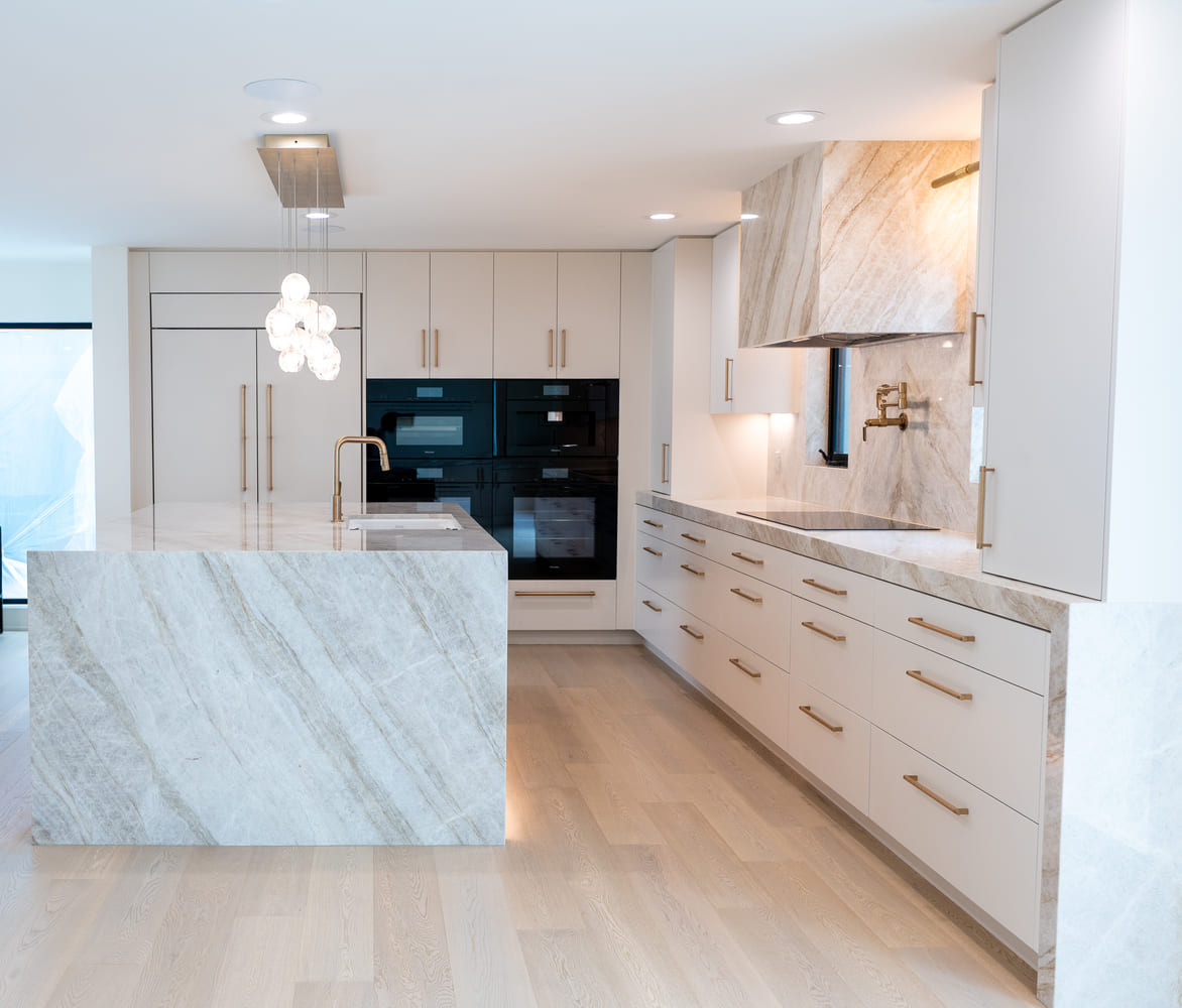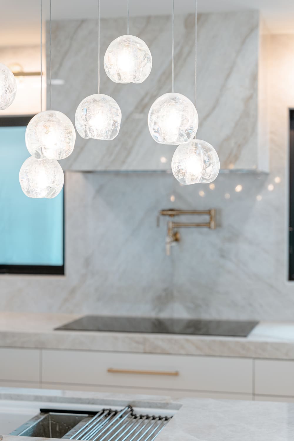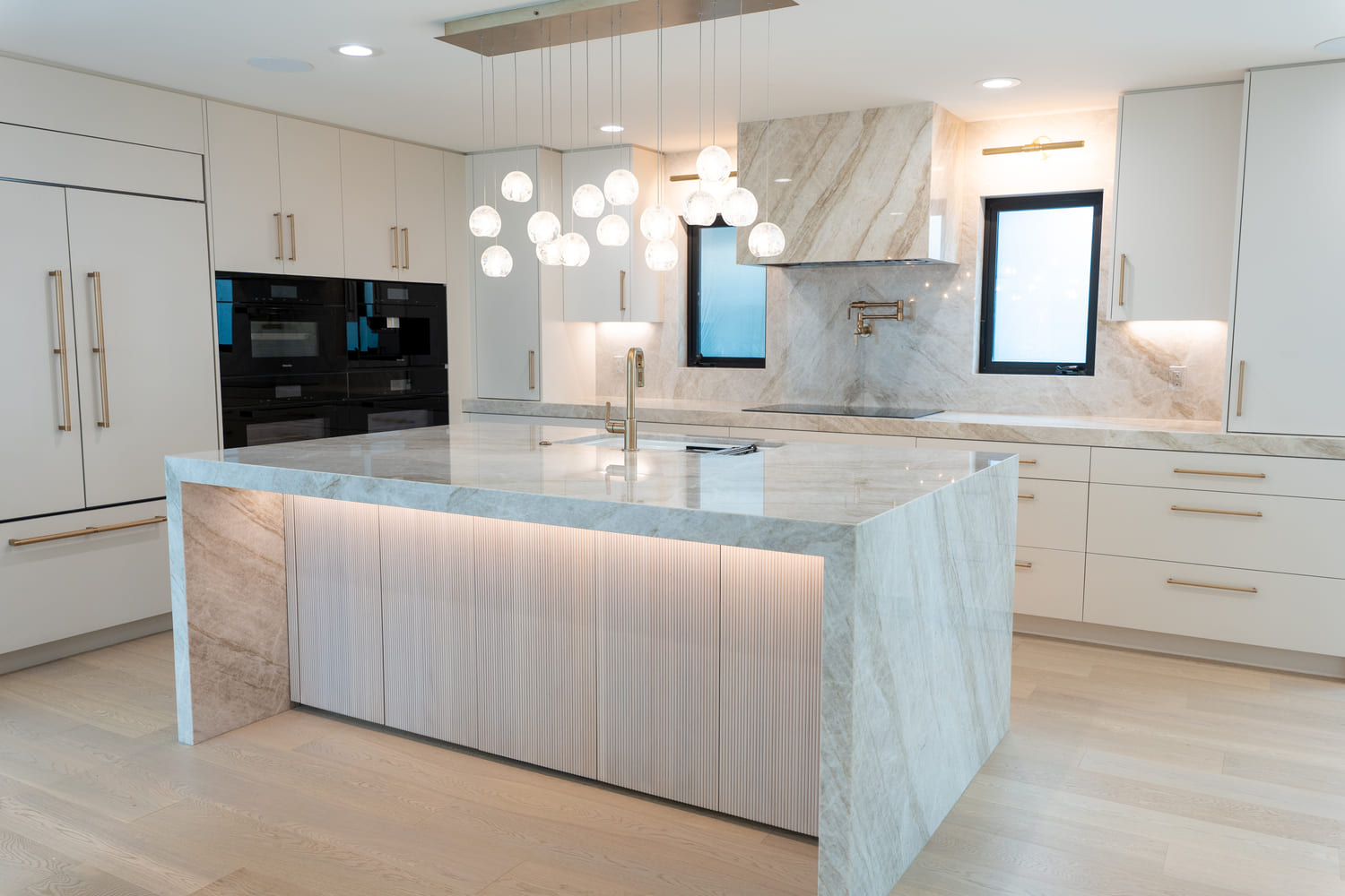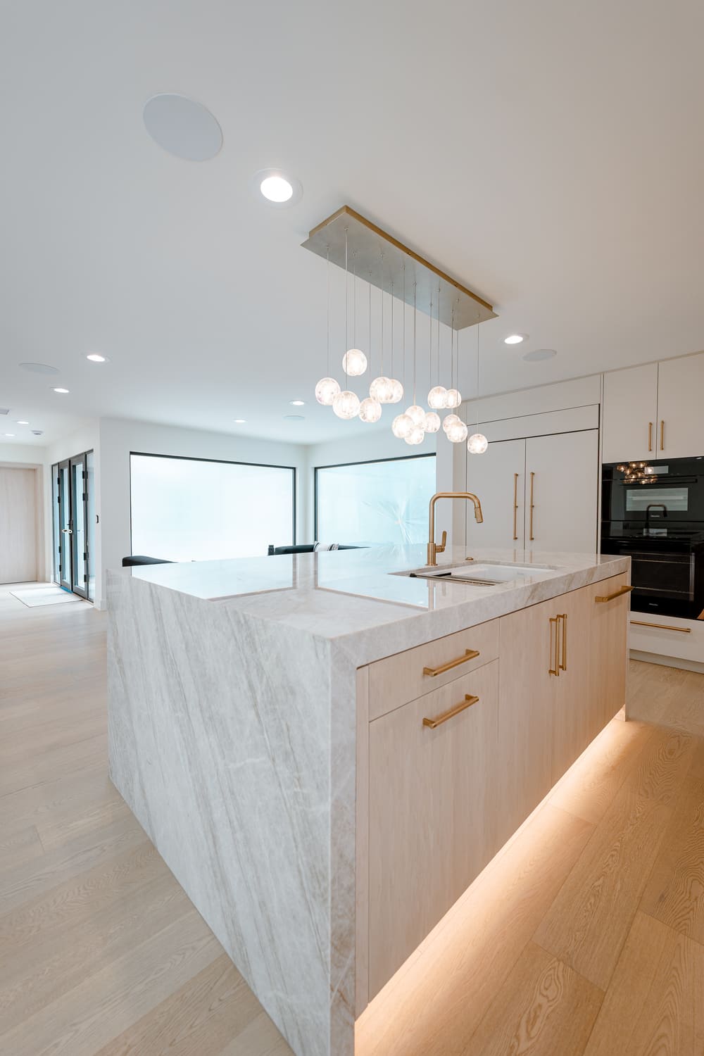 This high-end custom residential remodel is a stunning example of modern luxury, seamlessly blending elegance and functionality to create a home that is both visually striking and exceptionally livable. The kitchen serves as the heart of the home, designed with sleek quartzite countertops and backsplashes that bring a sense of timeless sophistication. Custom cabinetry, tailored to perfection, offers ample storage while maintaining clean, minimalist lines, and gold accents subtly elevate the space, adding a touch of glamour without overwhelming the design. A sculptural lighting fixture hangs as a captivating centerpiece, casting a warm and inviting glow that enhances the ambiance and makes the kitchen a true focal point for gatherings and daily life.