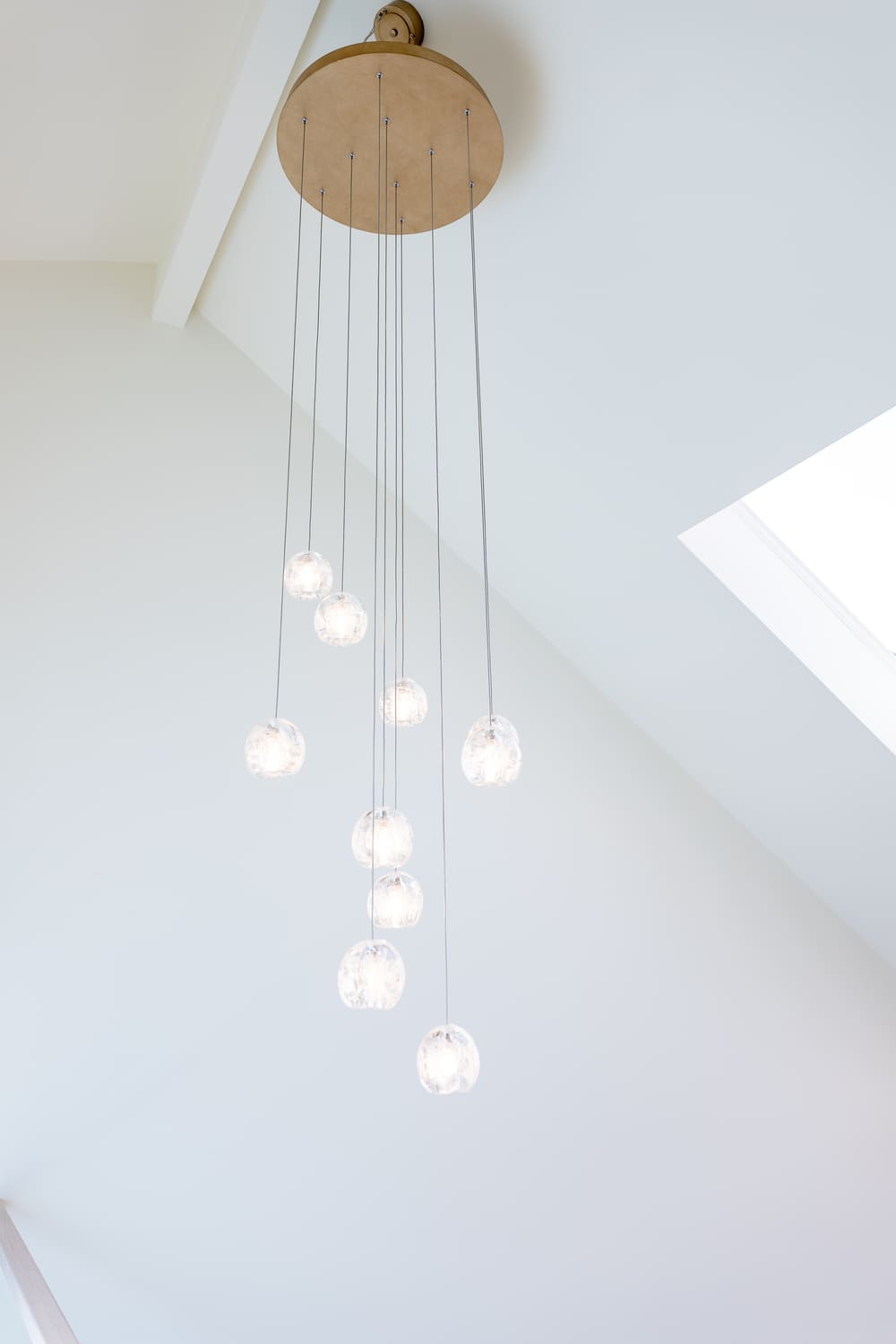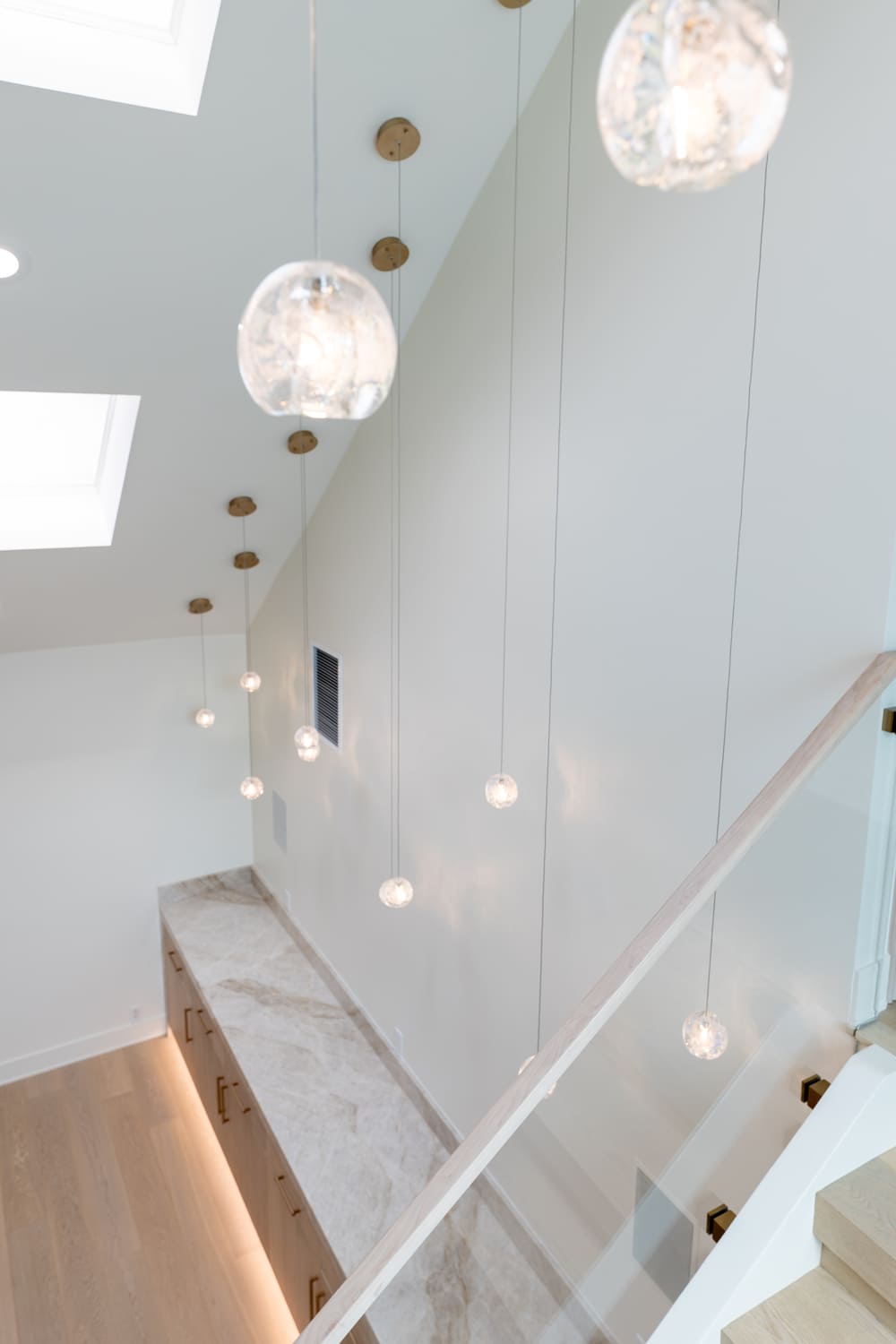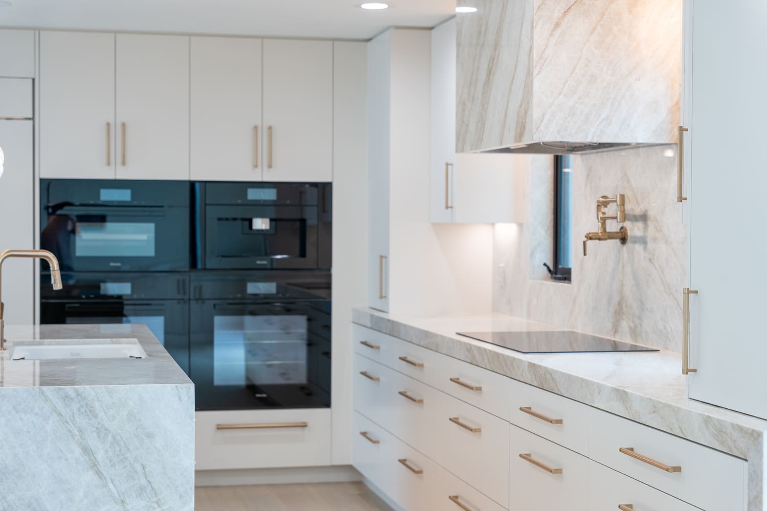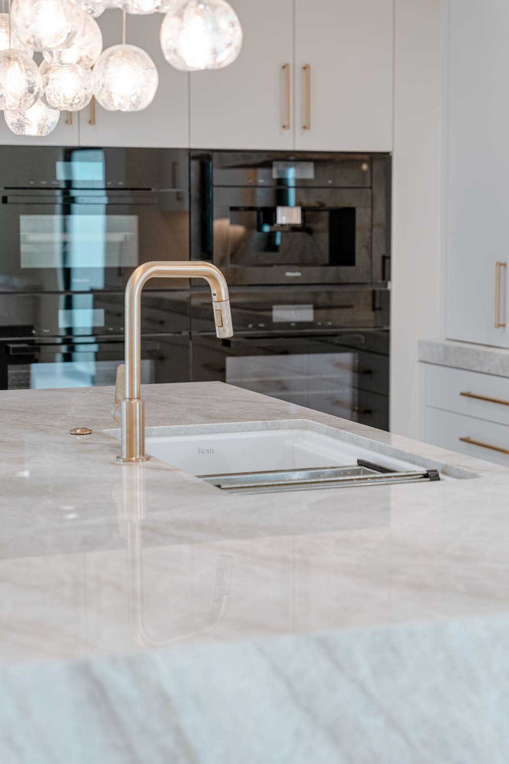 This high-end custom residential remodel is a stunning example of modern luxury, seamlessly blending elegance and functionality to create a home that is both visually striking and exceptionally livable. The kitchen serves as the heart of the home, designed with sleek quartzite countertops and backsplashes that bring a sense of timeless sophistication. Custom cabinetry, tailored to perfection, offers ample storage while maintaining clean, minimalist lines, and gold accents subtly elevate the space, adding a touch of glamour without overwhelming the design. A sculptural lighting fixture hangs as a captivating centerpiece, casting a warm and inviting glow that enhances the ambiance and makes the kitchen a true focal point for gatherings and daily life.
