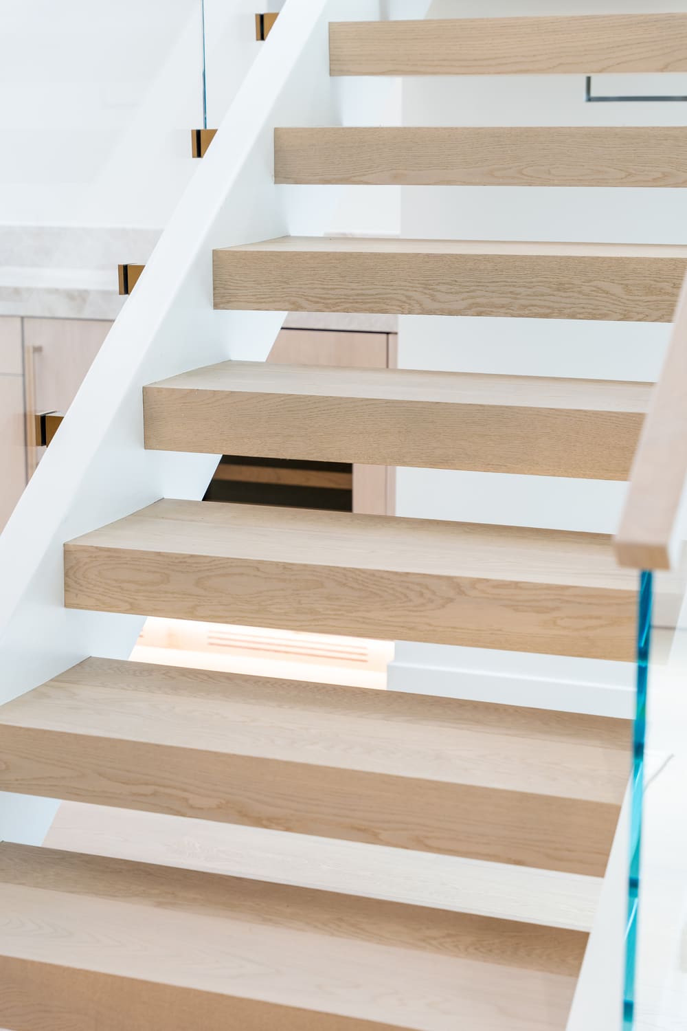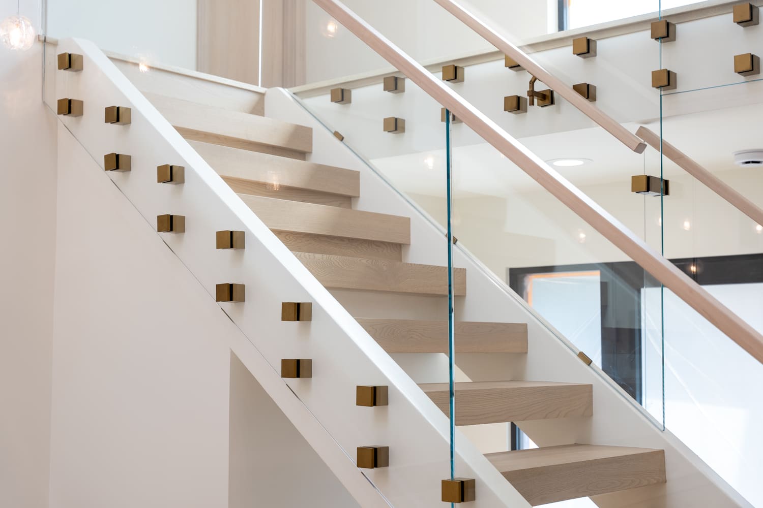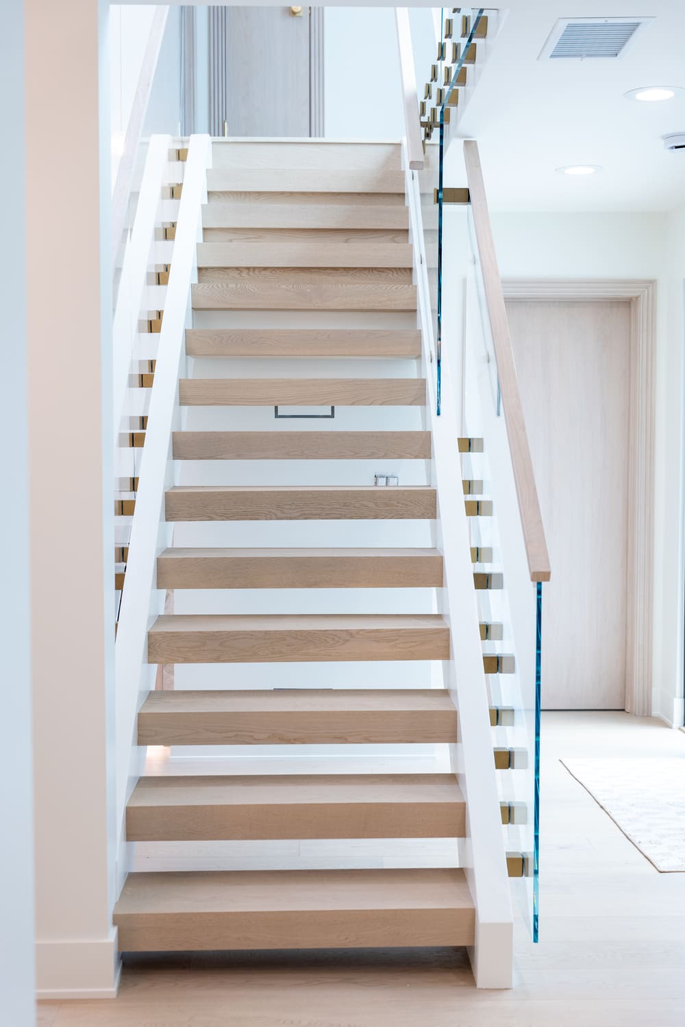 Flowing from the kitchen, the open-concept layout leads to an elegantly modern staircase, crafted from white oak, and adorned with glass railings. This architectural feature not only serves as a functional element but also as a statement piece, harmonizing effortlessly with the home’s neutral tones and creating a sense of airy openness. Throughout the home, a carefully curated palette of soft, natural hues ensures a cohesive design aesthetic, while textures and materials are layered to balance comfort with contemporary style.