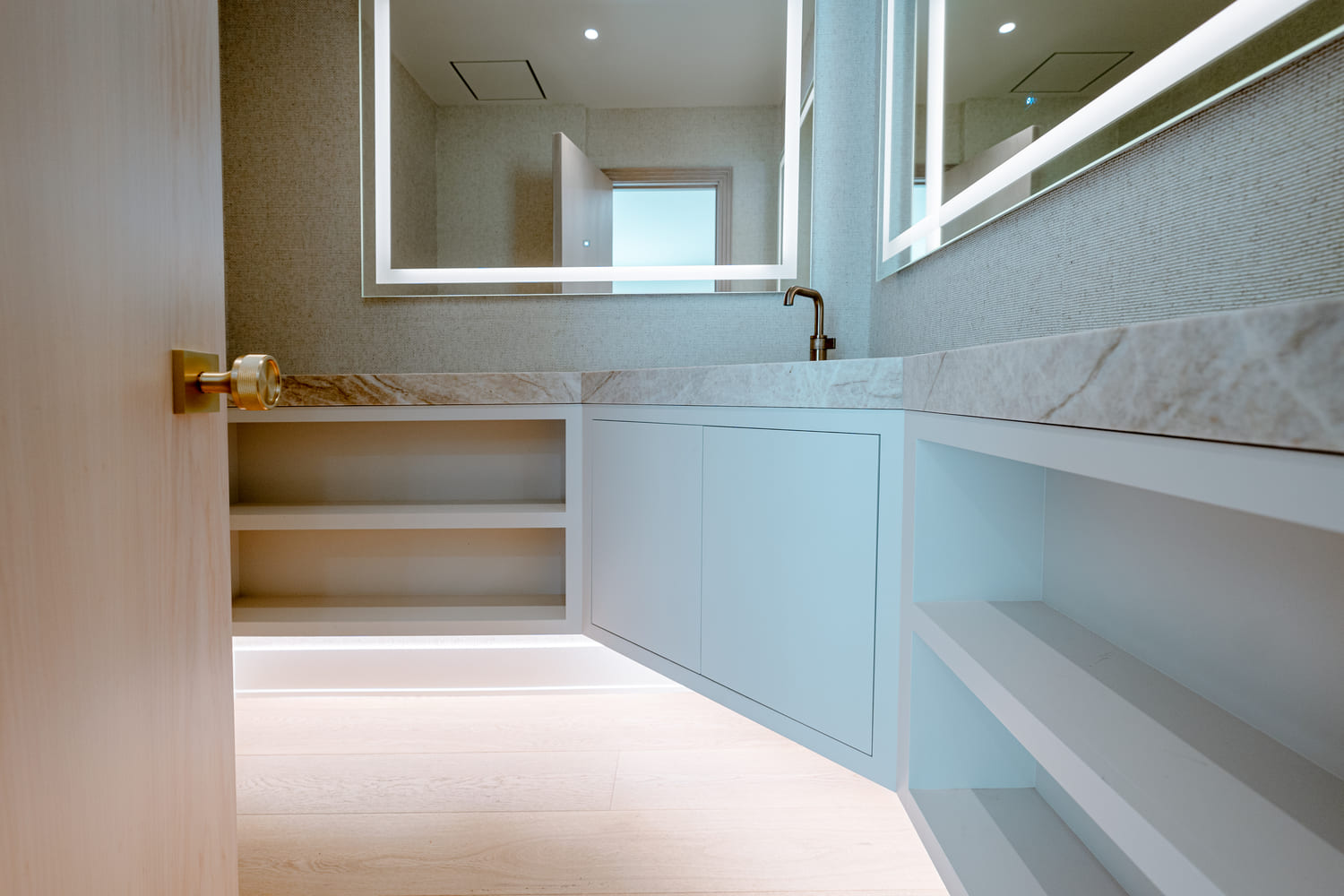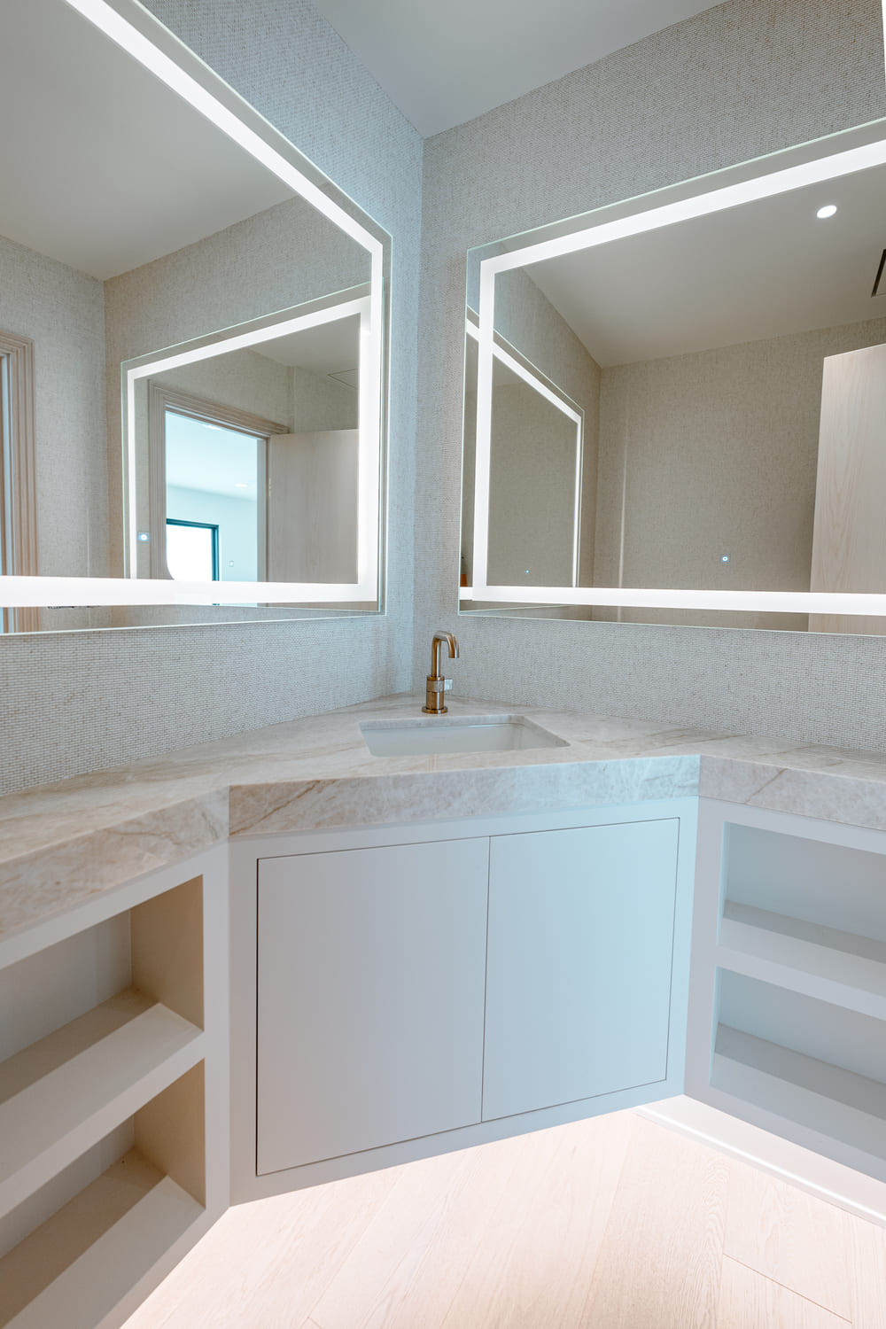 The powder bathroom is a sanctuary of modern design, featuring quartzite sinks that exude sophistication and hidden storage solutions that maintain the clean, uncluttered look. Illuminated mirrors add both functionality and a luxurious touch, reflecting light to brighten the space. Each element is thoughtfully selected to blend form and utility, ensuring that the bathroom is as practical as it is stunning.
