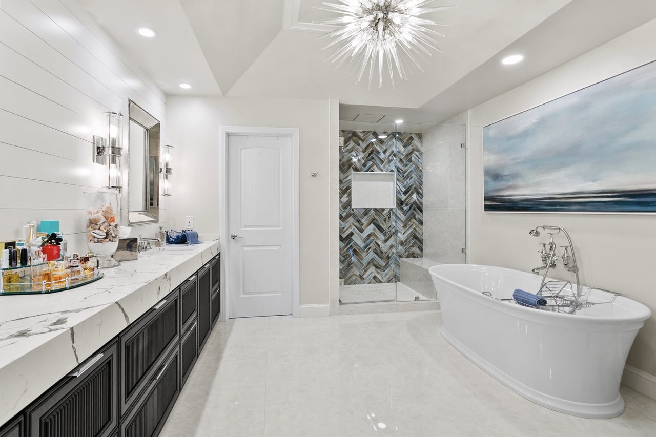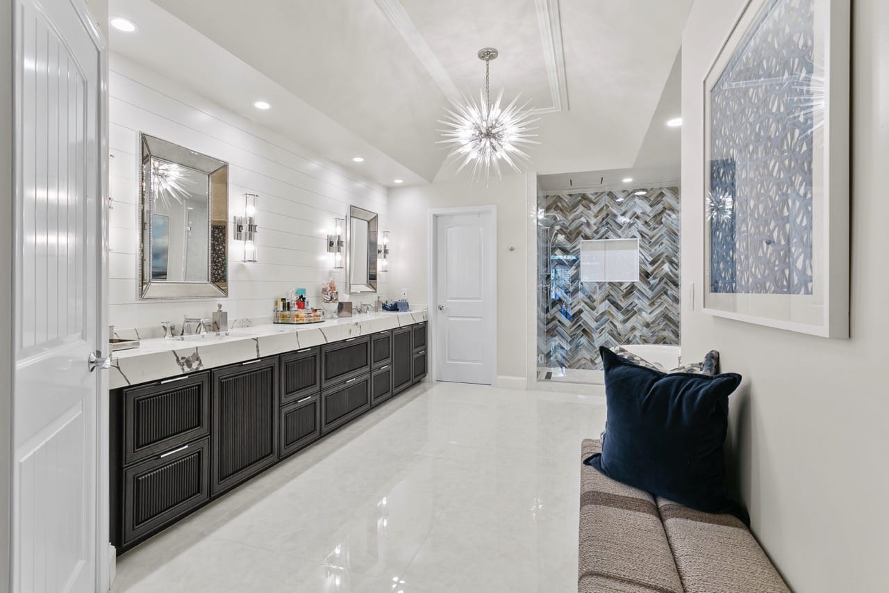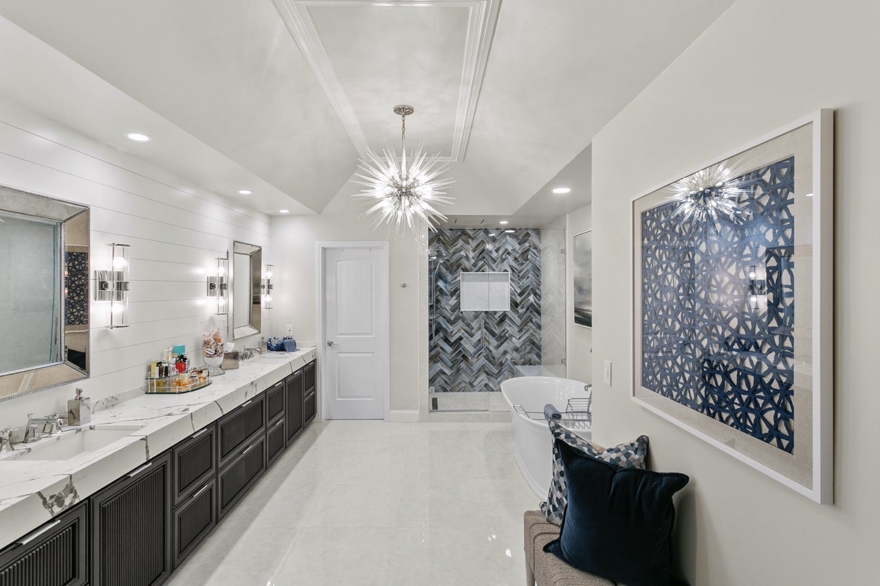 This residential remodel included a full transformation of the primary bathroom and a series of elevated aesthetic updates throughout the home. In the bathroom, we reimagined the space with custom tilework, modern fixtures, and a serene yet striking palette to create a spa-like retreat. Additional design enhancements were made in the living room, family room, and kitchenette area, blending comfort with style through updated finishes, curated furnishings, and thoughtful details that brought a fresh, cohesive feel to the home.