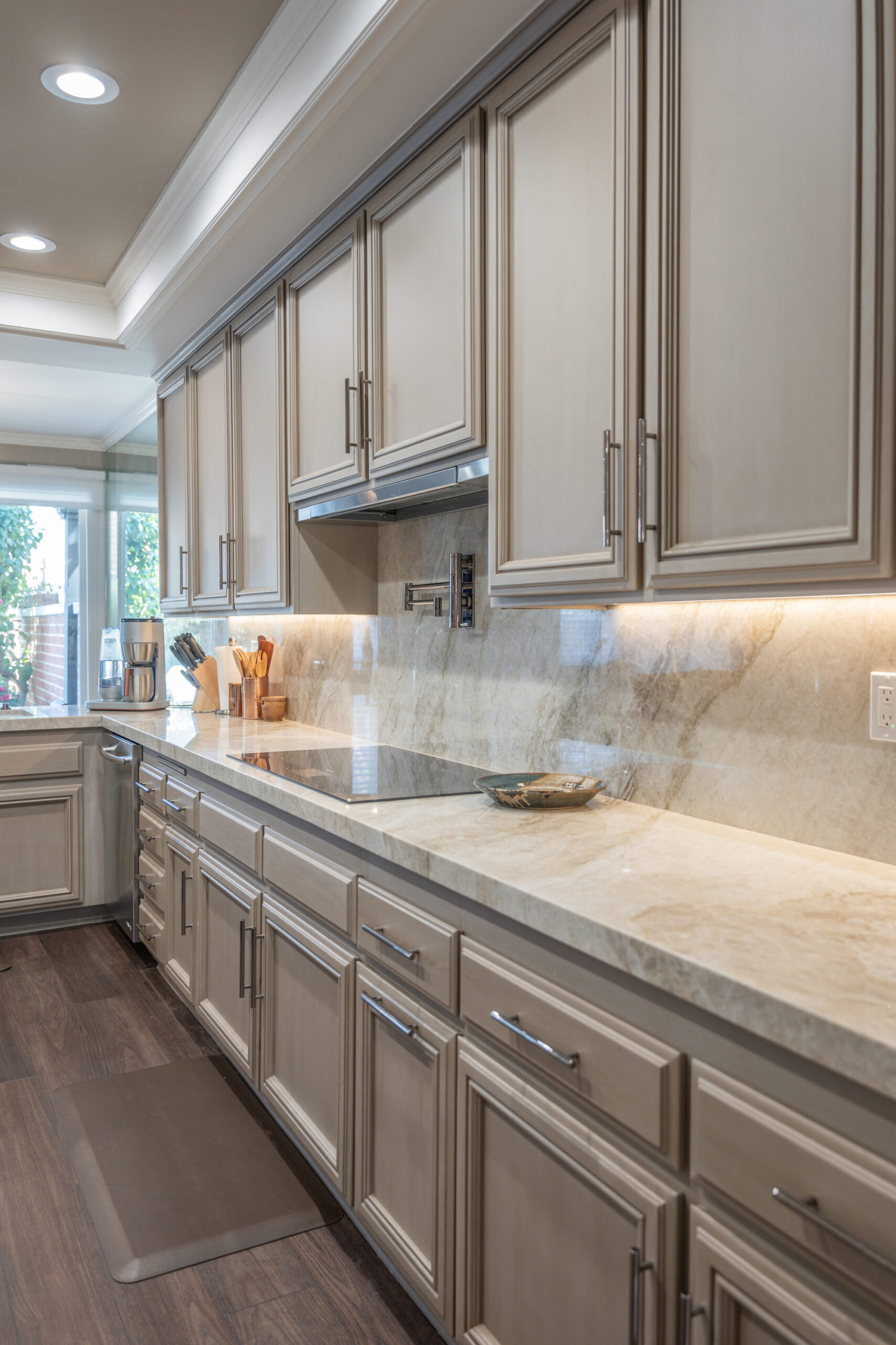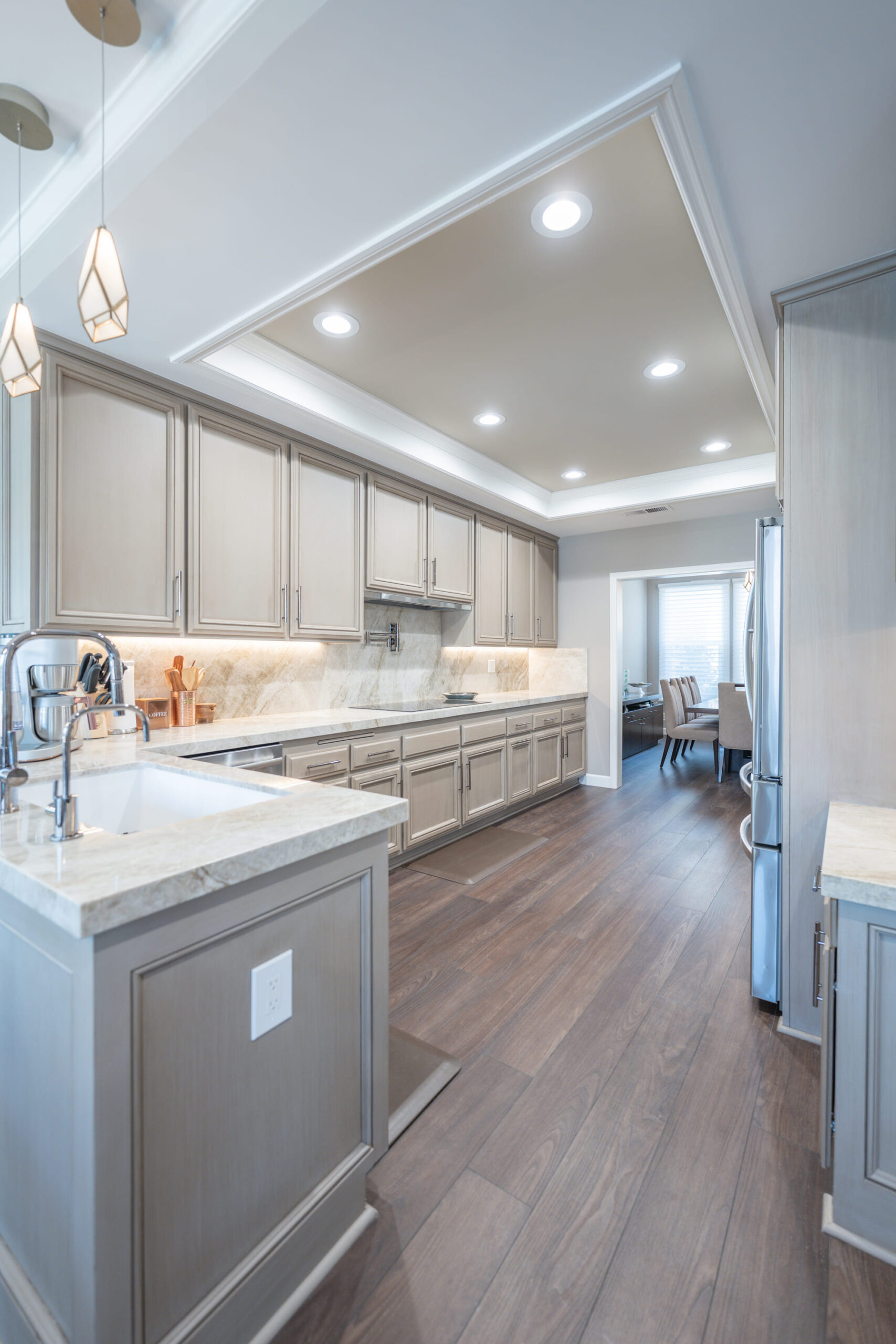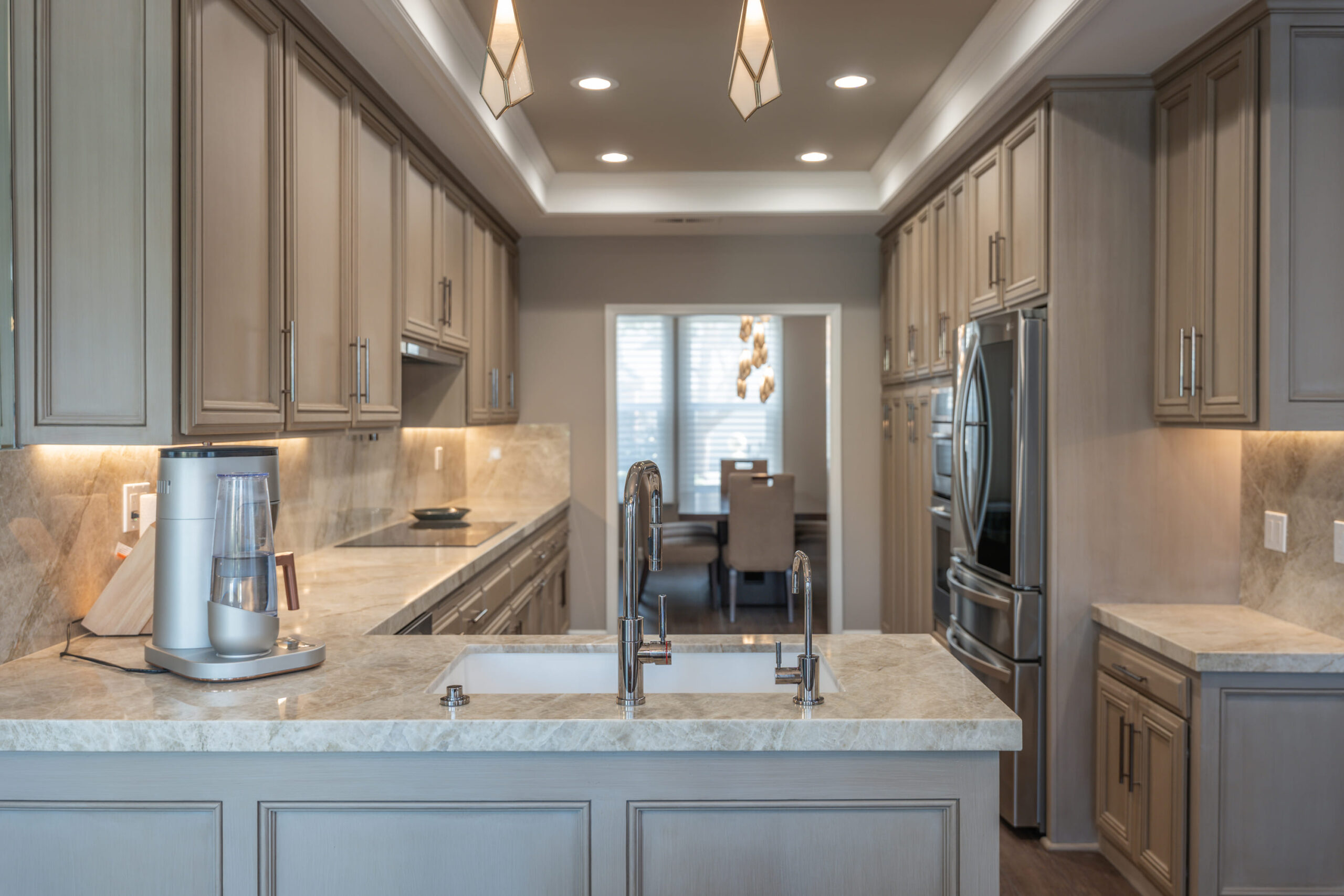 The kitchen features custom cabinetry with a soft beige finish, paired with a luxurious quartzite countertop that adds depth and texture to the space. The sleek, modern appliances are integrated seamlessly, with under-cabinet lighting highlighting the beauty of the stone surfaces. Above the kitchen, the contemporary pendant lights add an artistic touch while providing the perfect amount of ambient lighting.