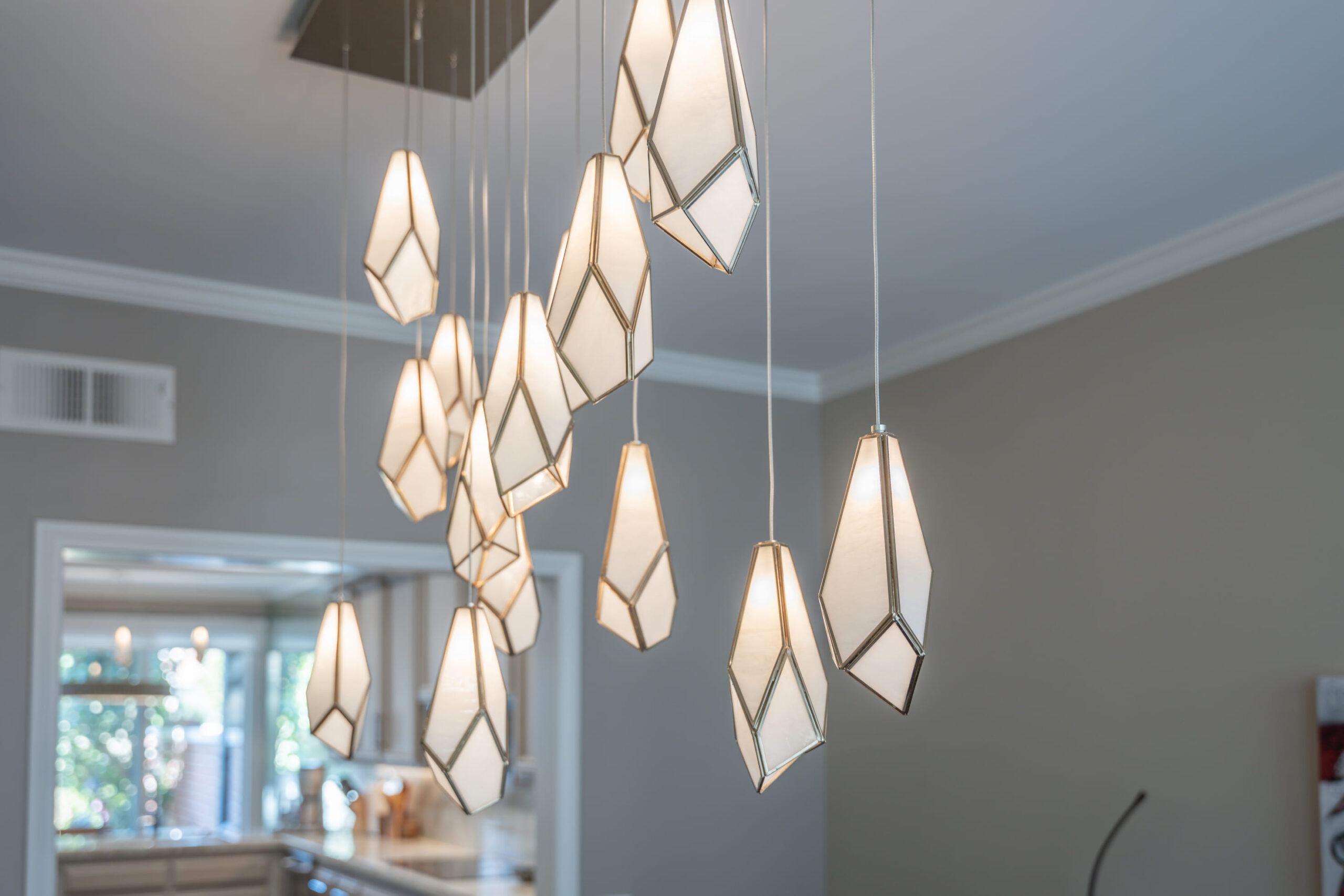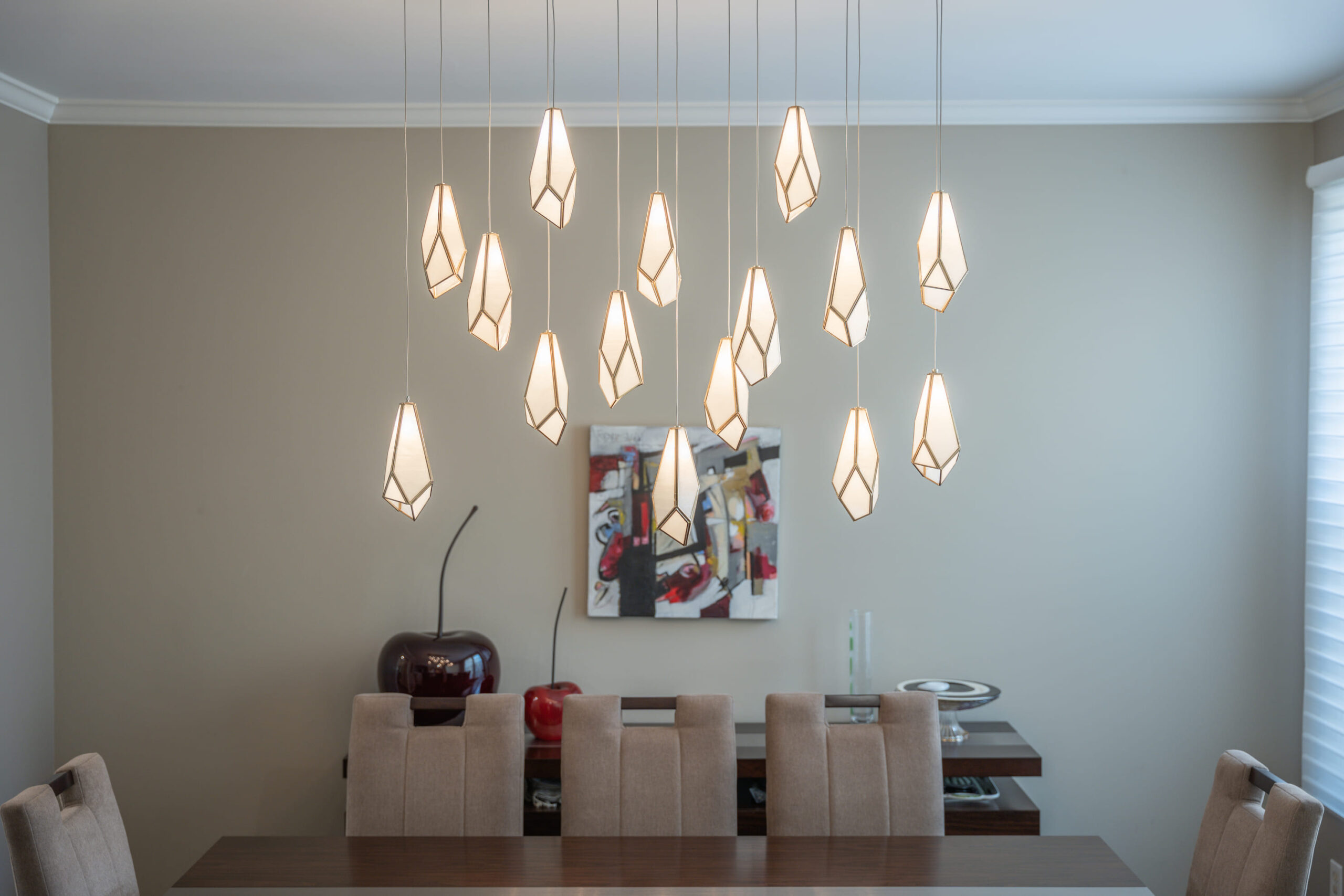 Adjacent to the kitchen, the dining area is illuminated by a set of unique geometric pendant lights that create a visual focal point. The clean lines of the dining table and modern chairs complement the overall aesthetic, bringing a sophisticated feel to the room.