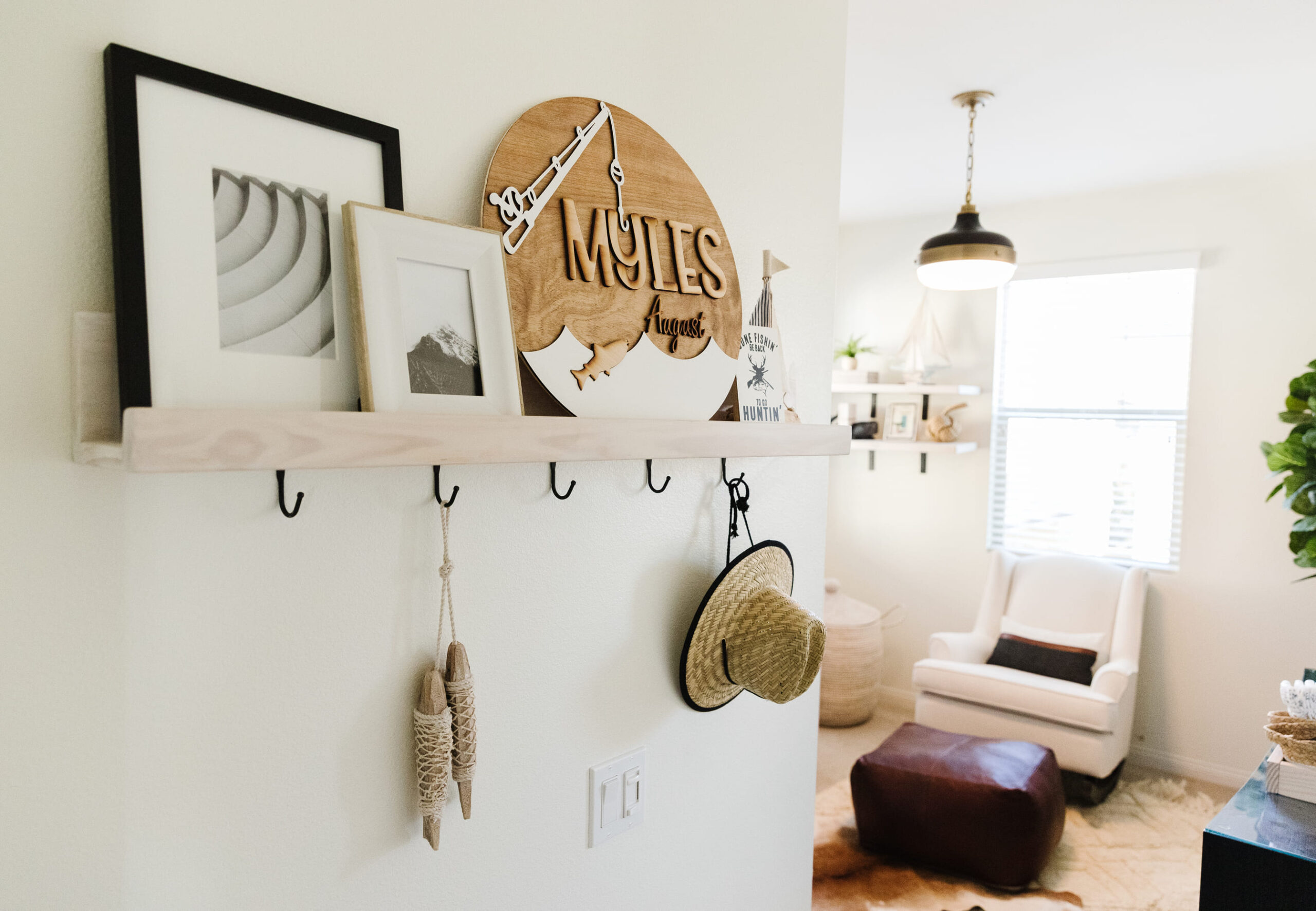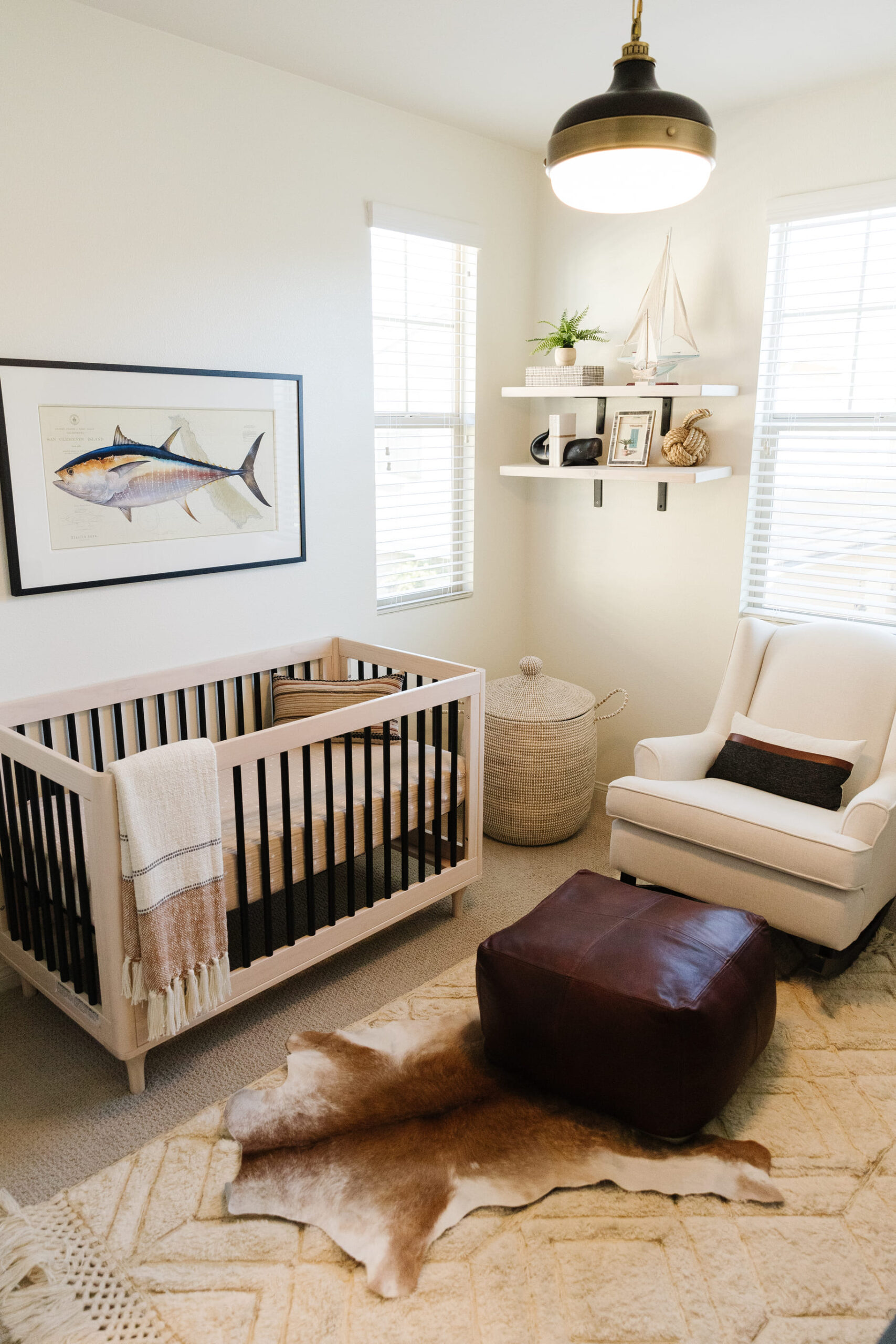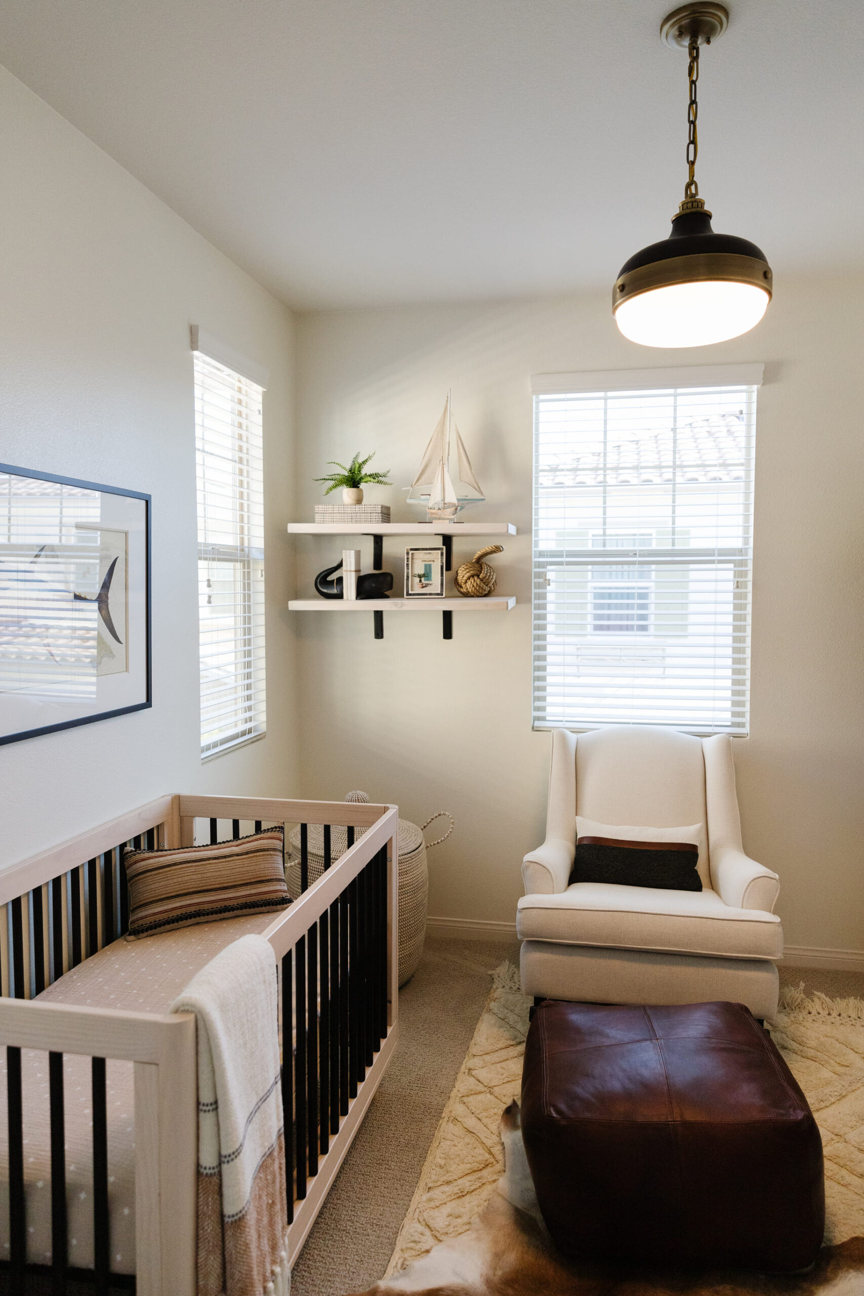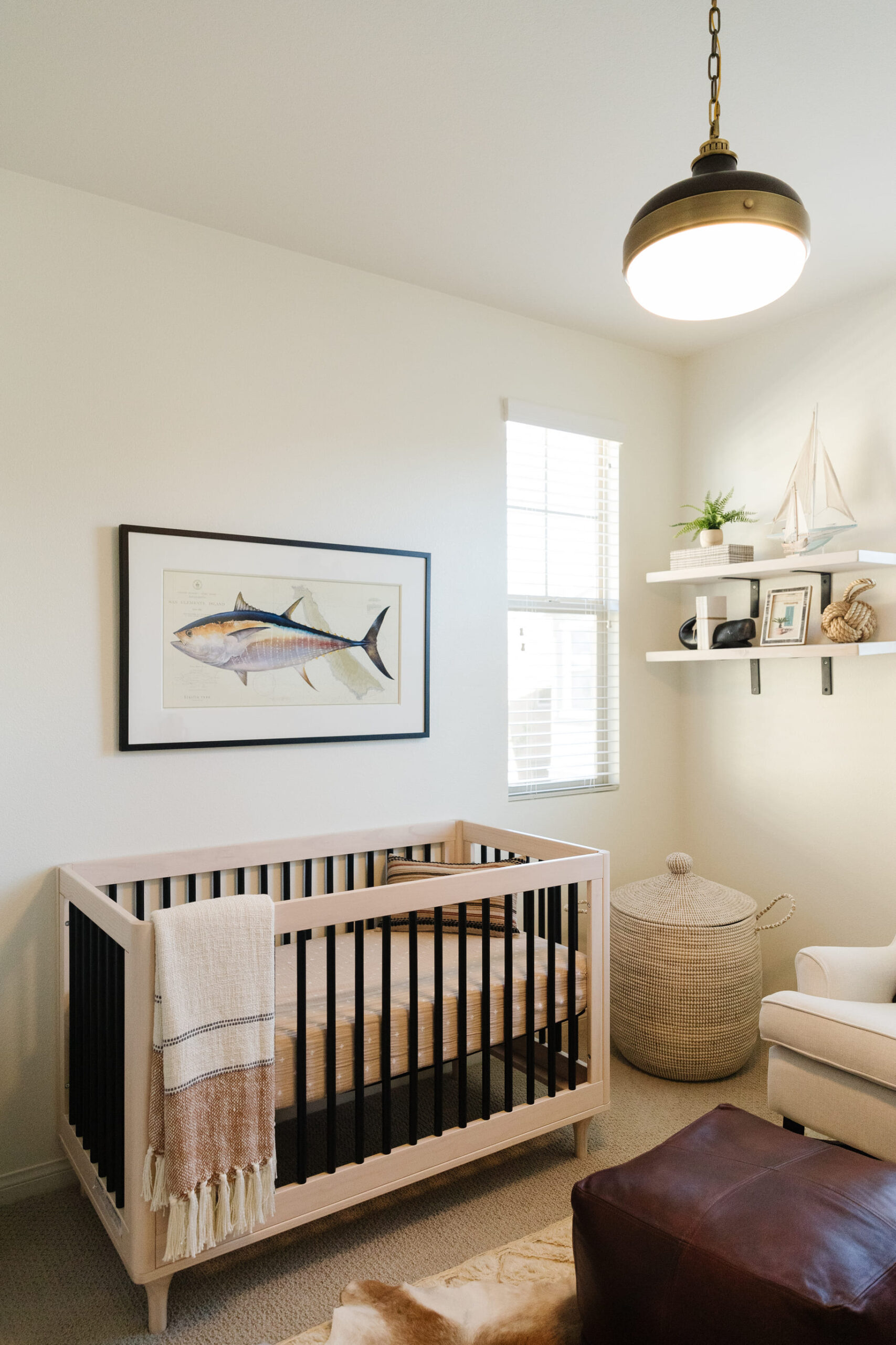 This fun nursery was thoughtfully arranged with a minimalist touch, where a wooden crib serves as the central piece. Soft, neutral tones fill the room, while floating shelves above the crib display charming nautical-themed decor, including a small sailboat and framed artwork. The addition of a cozy armchair with an ottoman in the corner creates a comfortable spot for moments of relaxation or feeding, while a large woven basket adds texture and practicality. A lush potted plant brings nature indoors, enhancing the soothing, tranquil atmosphere. The design is complemented by soft, ambient lighting, making the space feel calm and inviting.
