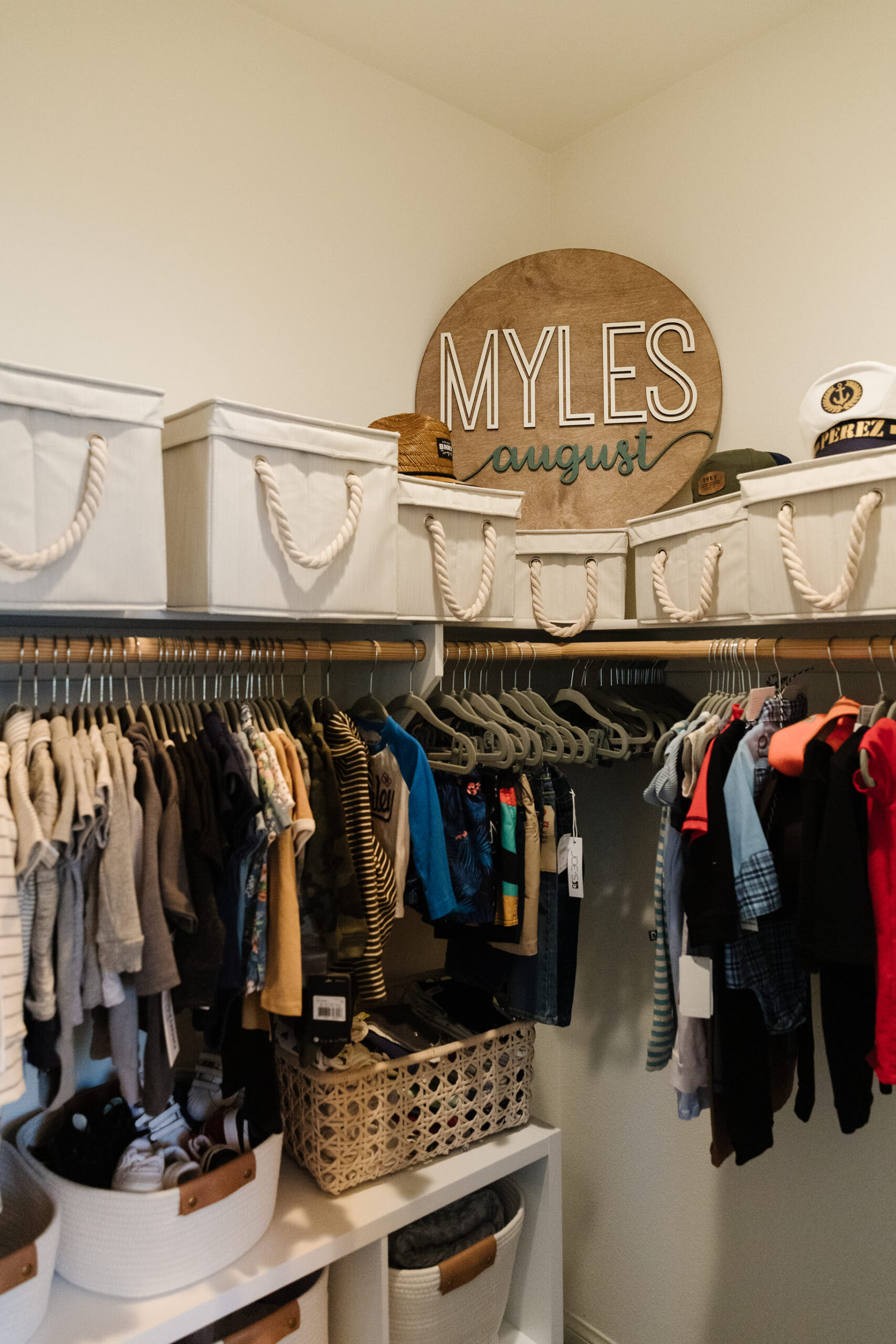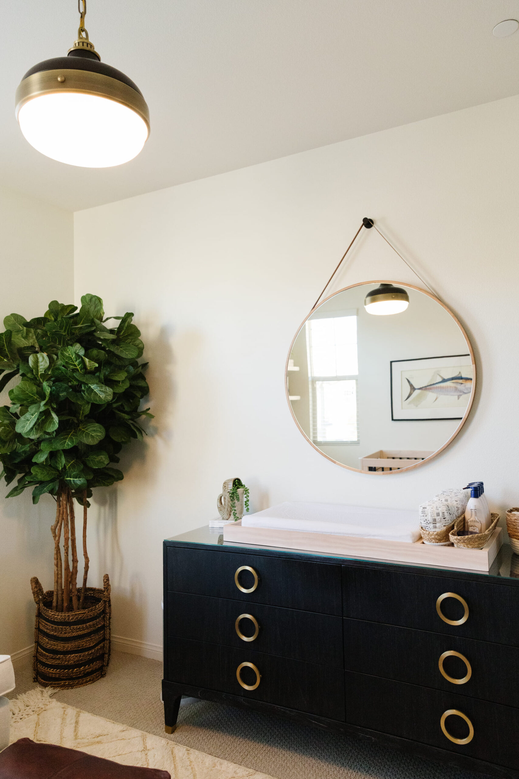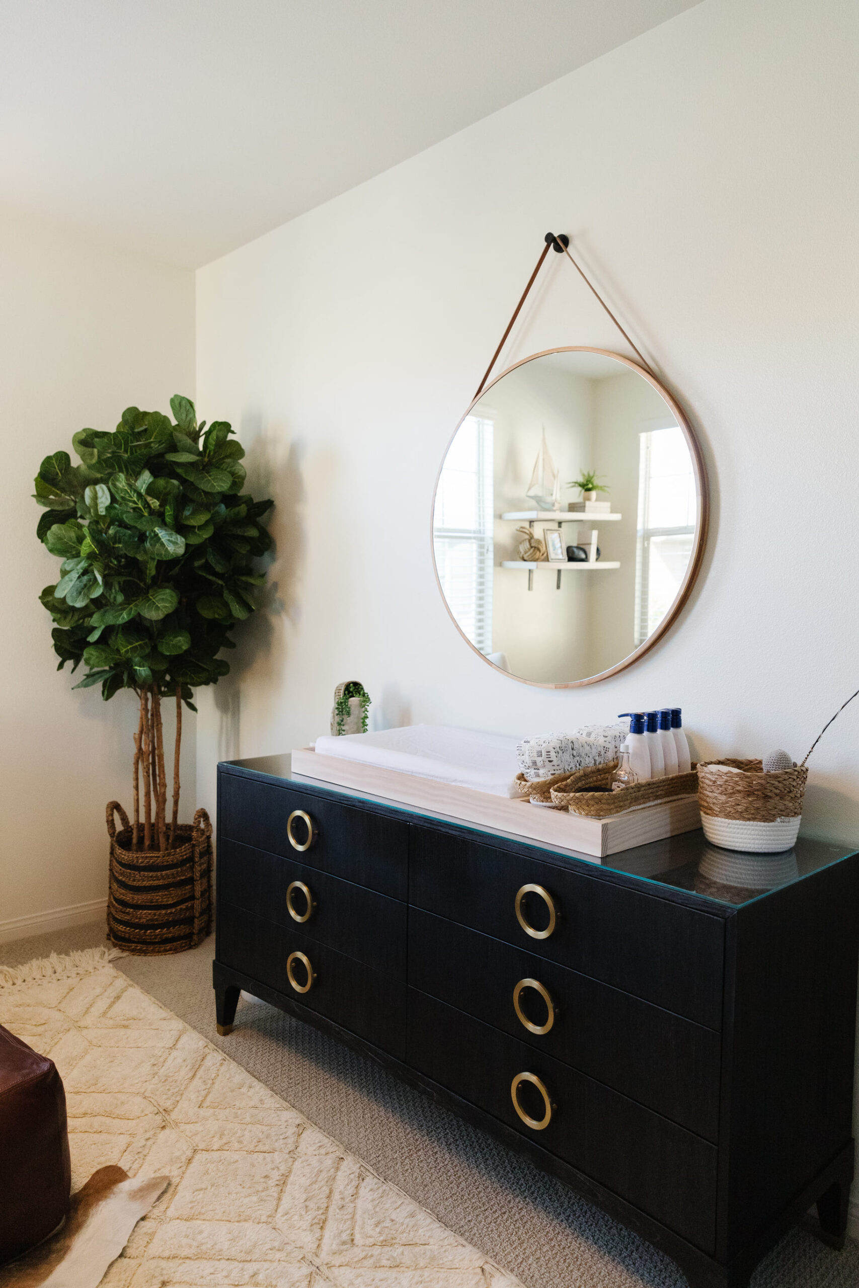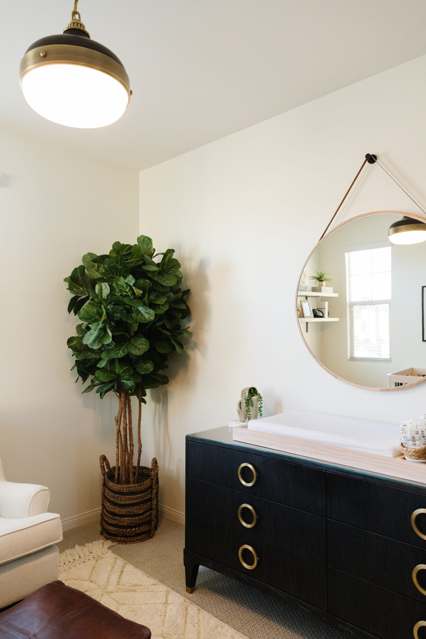This fun nursery was thoughtfully arranged with a minimalist touch, where a wooden crib serves as the central piece. Soft, neutral tones fill the room, while floating shelves above the crib display charming nautical-themed decor, including a small sailboat and framed artwork. The addition of a cozy armchair with an ottoman in the corner creates a comfortable spot for moments of relaxation or feeding, while a large woven basket adds texture and practicality. A lush potted plant brings nature indoors, enhancing the soothing, tranquil atmosphere. The design is complemented by soft, ambient lighting, making the space feel calm and inviting.