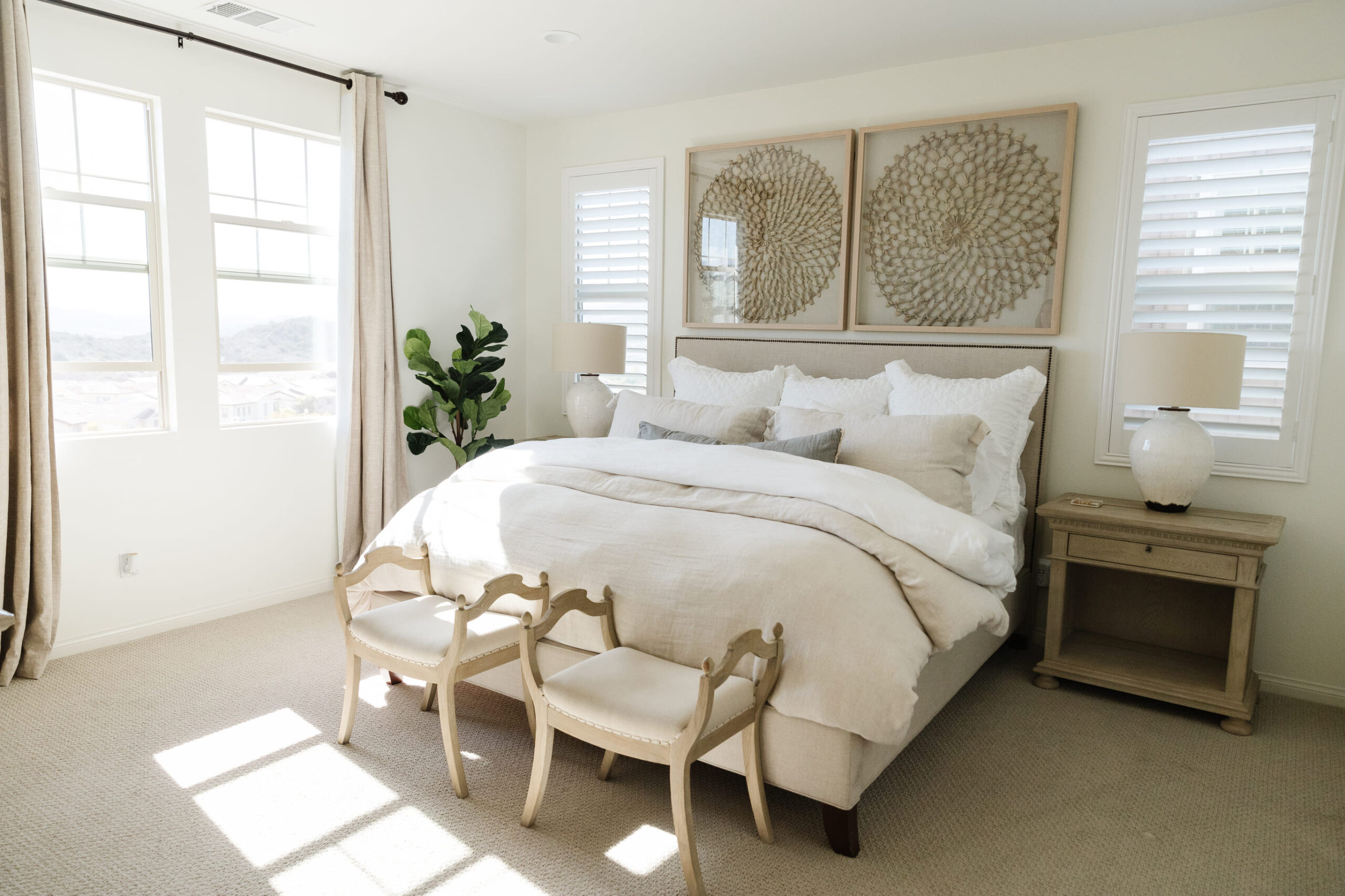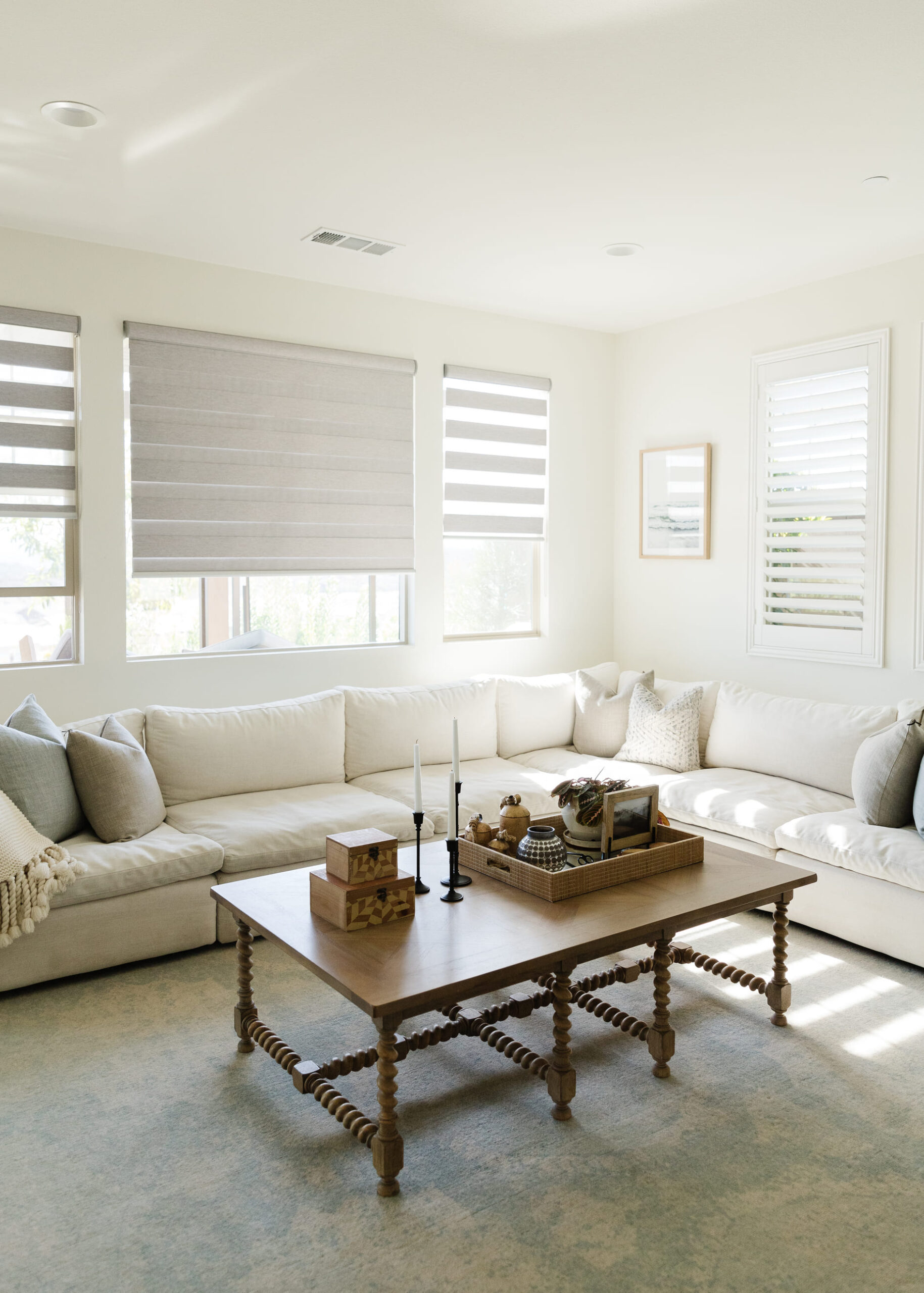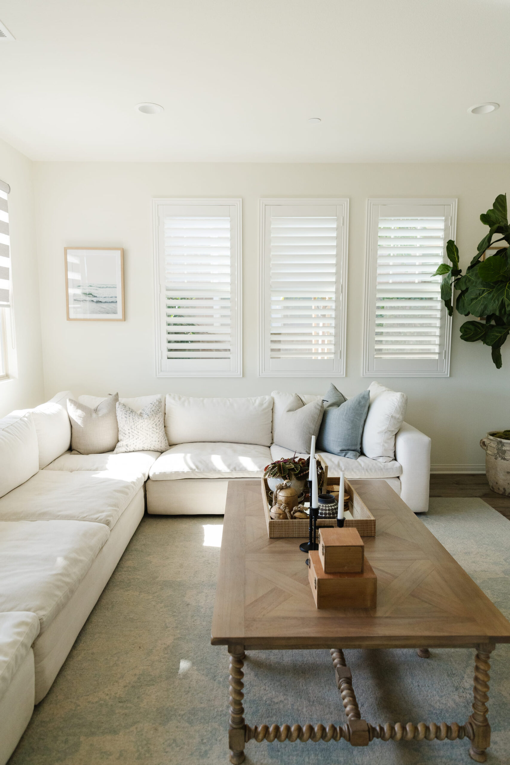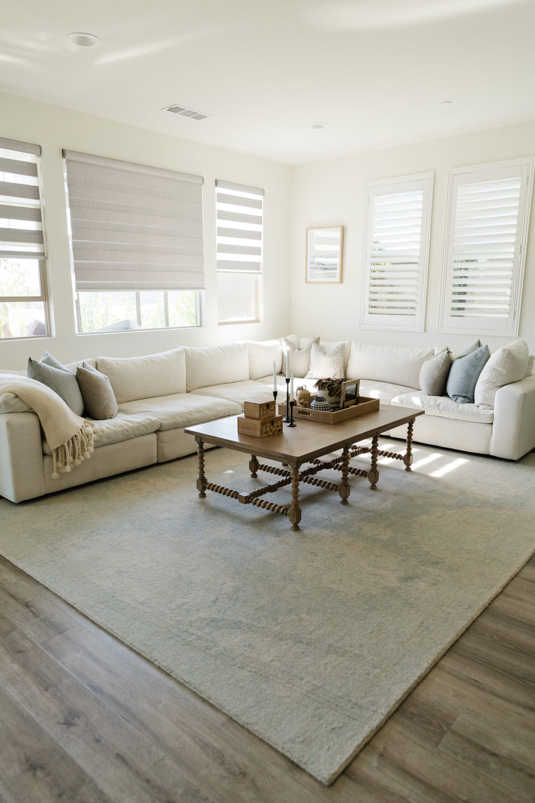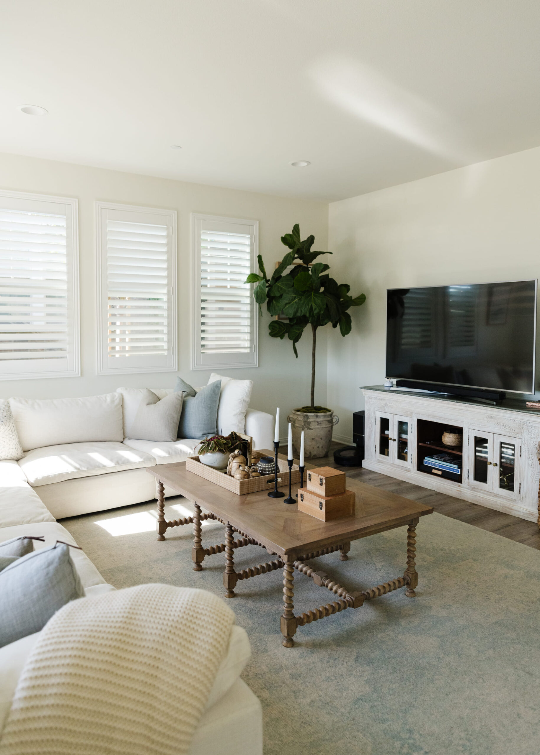 The design showcases a harmonious blend of contemporary and organic elements, emphasizing clean lines, neutral colors, and natural textures. Every detail, from the carefully chosen decor to the arrangement of furniture, contributes to a cohesive and inviting atmosphere. This redesign is perfect for a family home, balancing modern aesthetics with cozy, practical living.