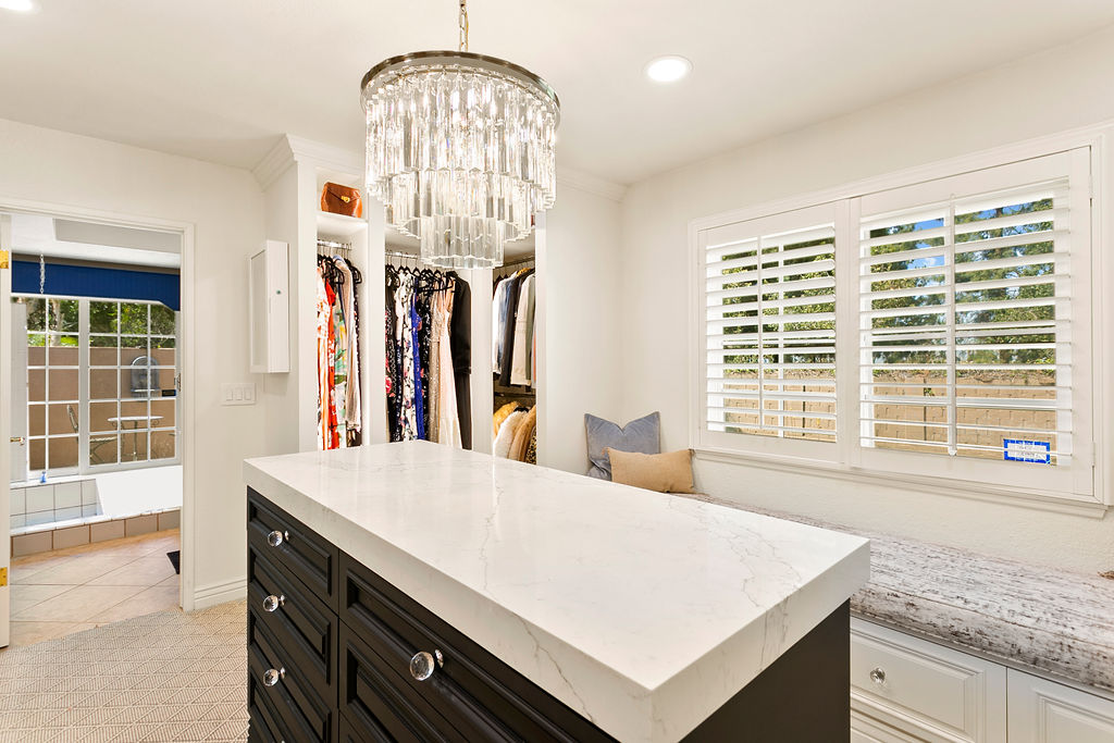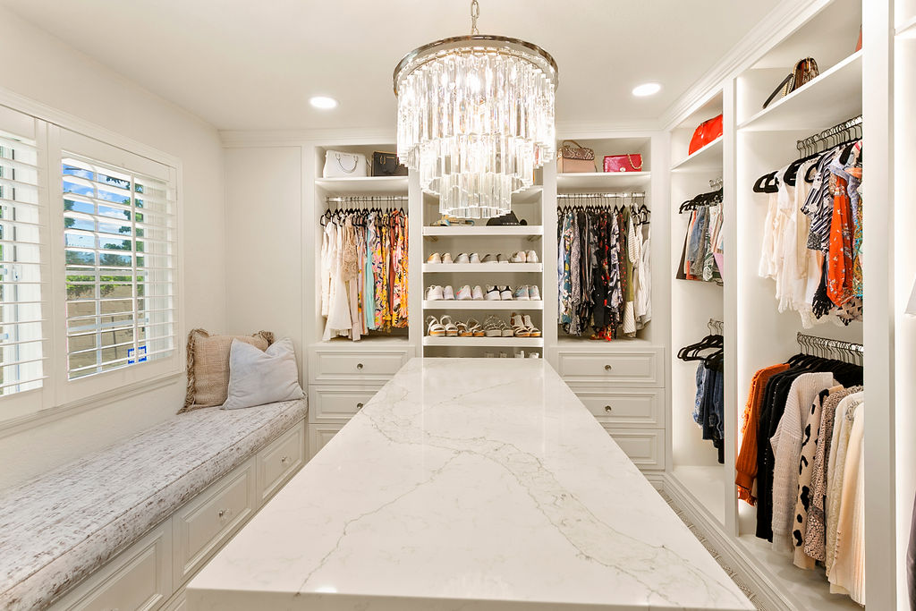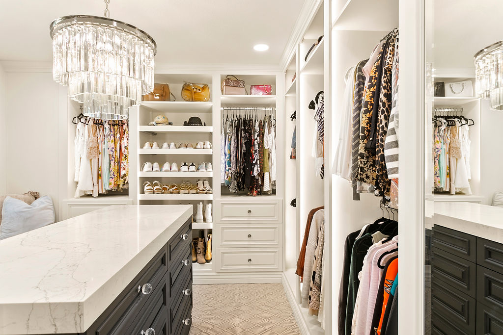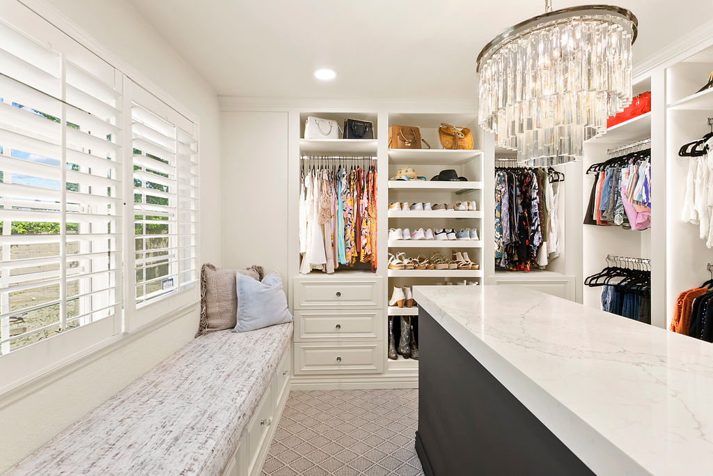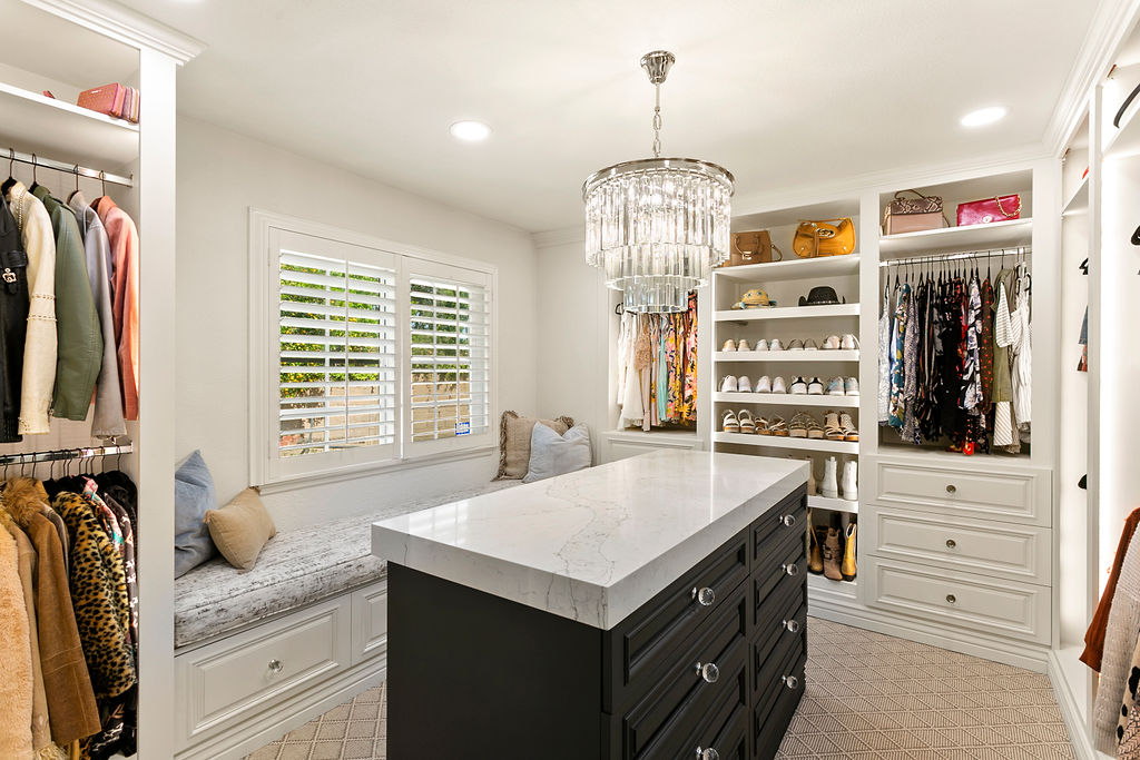 This elegant walk-in closet combines functionality with sophistication. Featuring custom shelving, a spacious central island with a sleek stone countertop, and high-end storage solutions, this design allows for effortless organization. A crystal chandelier adds a touch of glamour, illuminating the space beautifully. The bright, airy atmosphere is enhanced by large windows, making it a perfect blend of luxury and practicality for any fashion enthusiast. The overall design reflects a modern yet timeless aesthetic, ensuring both style and storage are prioritized.