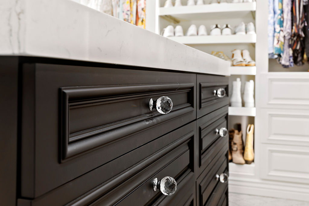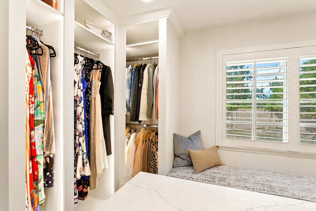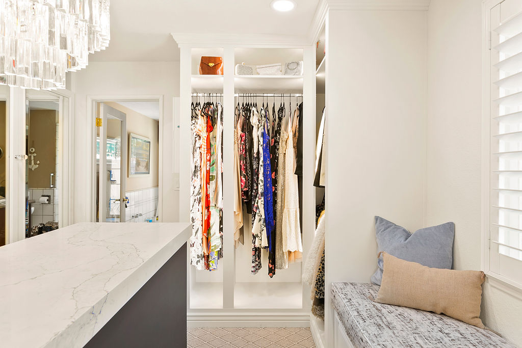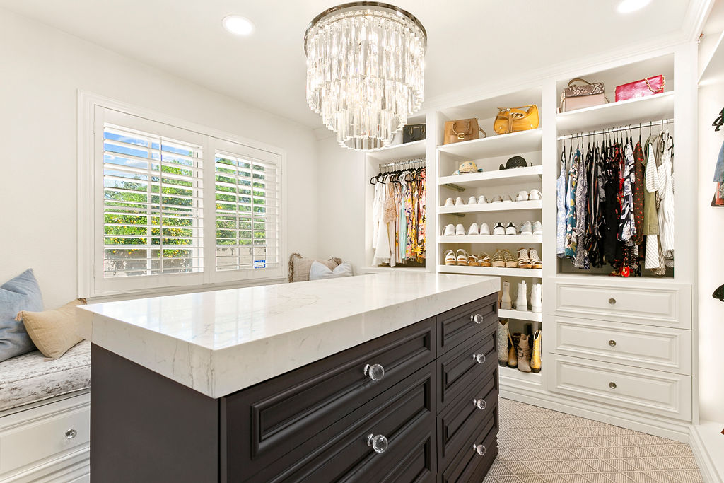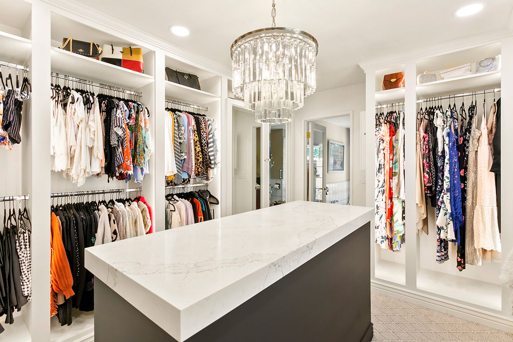 This elegant walk-in closet combines functionality with sophistication. Featuring custom shelving, a spacious central island with a sleek stone countertop, and high-end storage solutions, this design allows for effortless organization. A crystal chandelier adds a touch of glamour, illuminating the space beautifully. The bright, airy atmosphere is enhanced by large windows, making it a perfect blend of luxury and practicality for any fashion enthusiast. The overall design reflects a modern yet timeless aesthetic, ensuring both style and storage are prioritized.