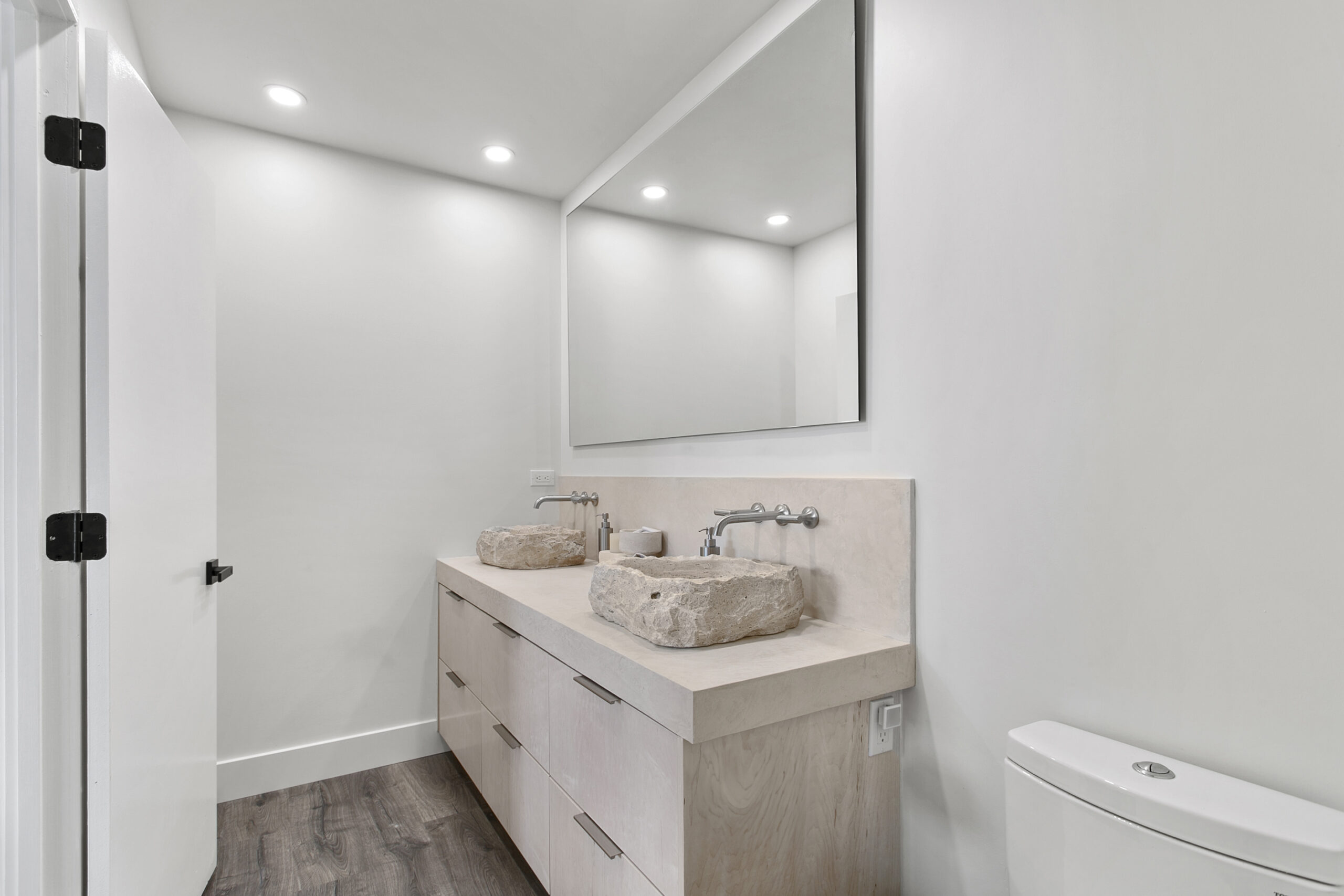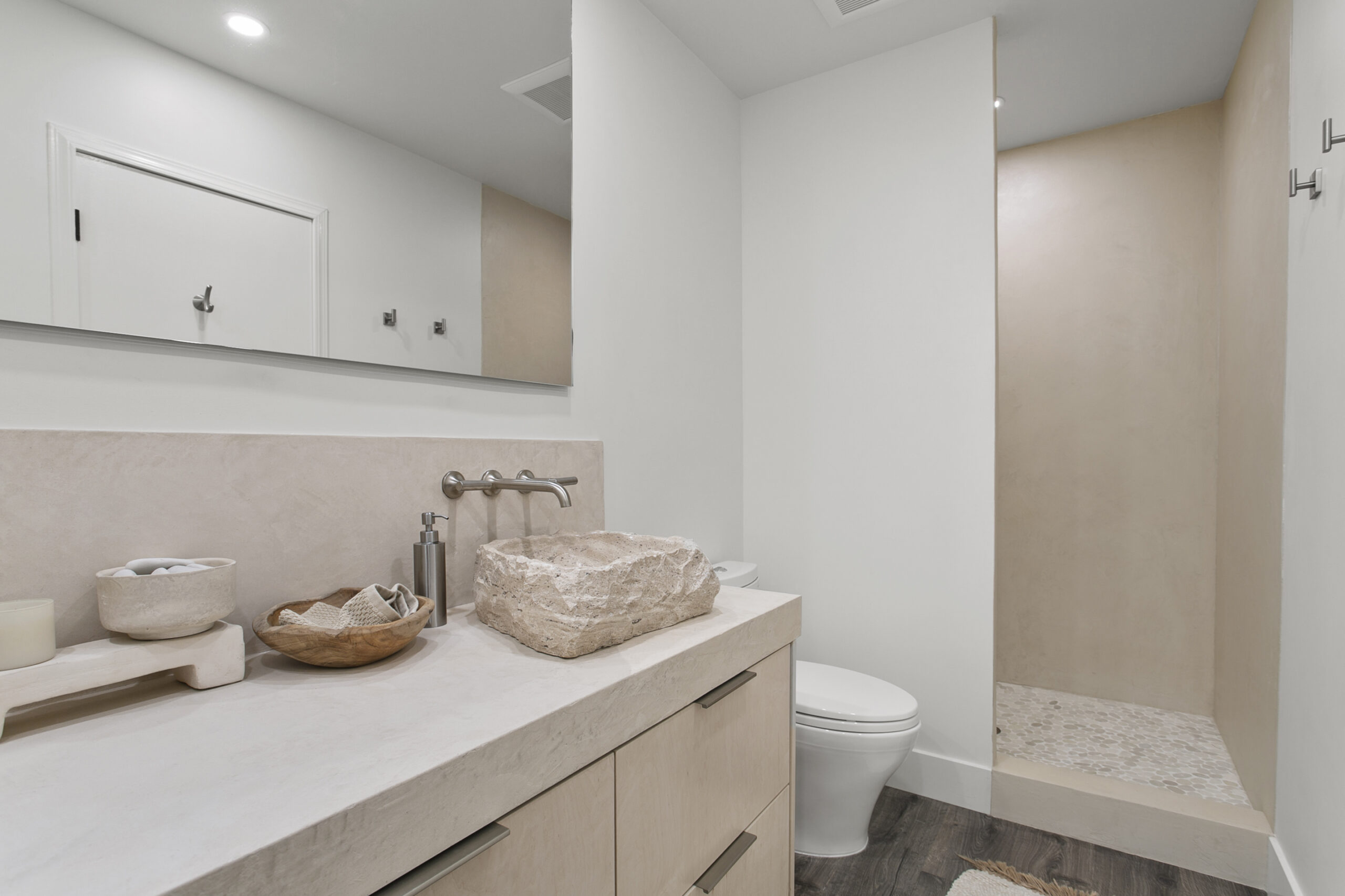 The bathroom exudes warmth and sophistication with light stained cabinetry and intricately carved stone sinks. These elements harmonize with the neutral tones of the walls and floors, creating a spa-like ambiance. The design balances practicality and elegance, turning routine tasks into enjoyable experiences.