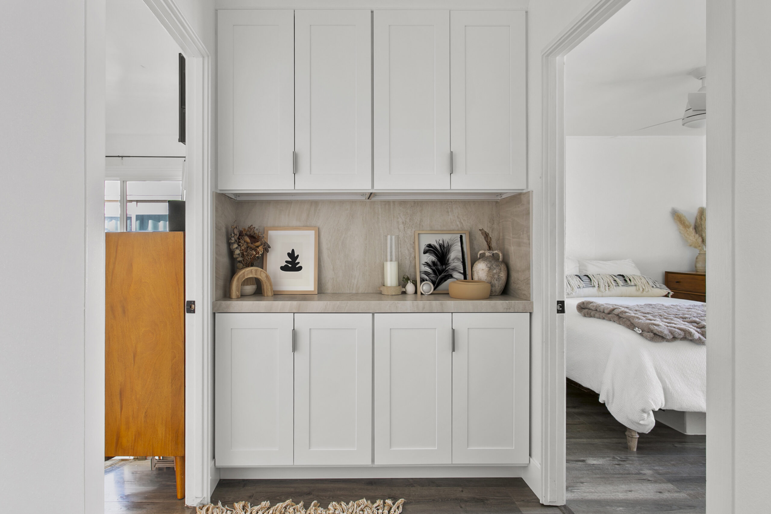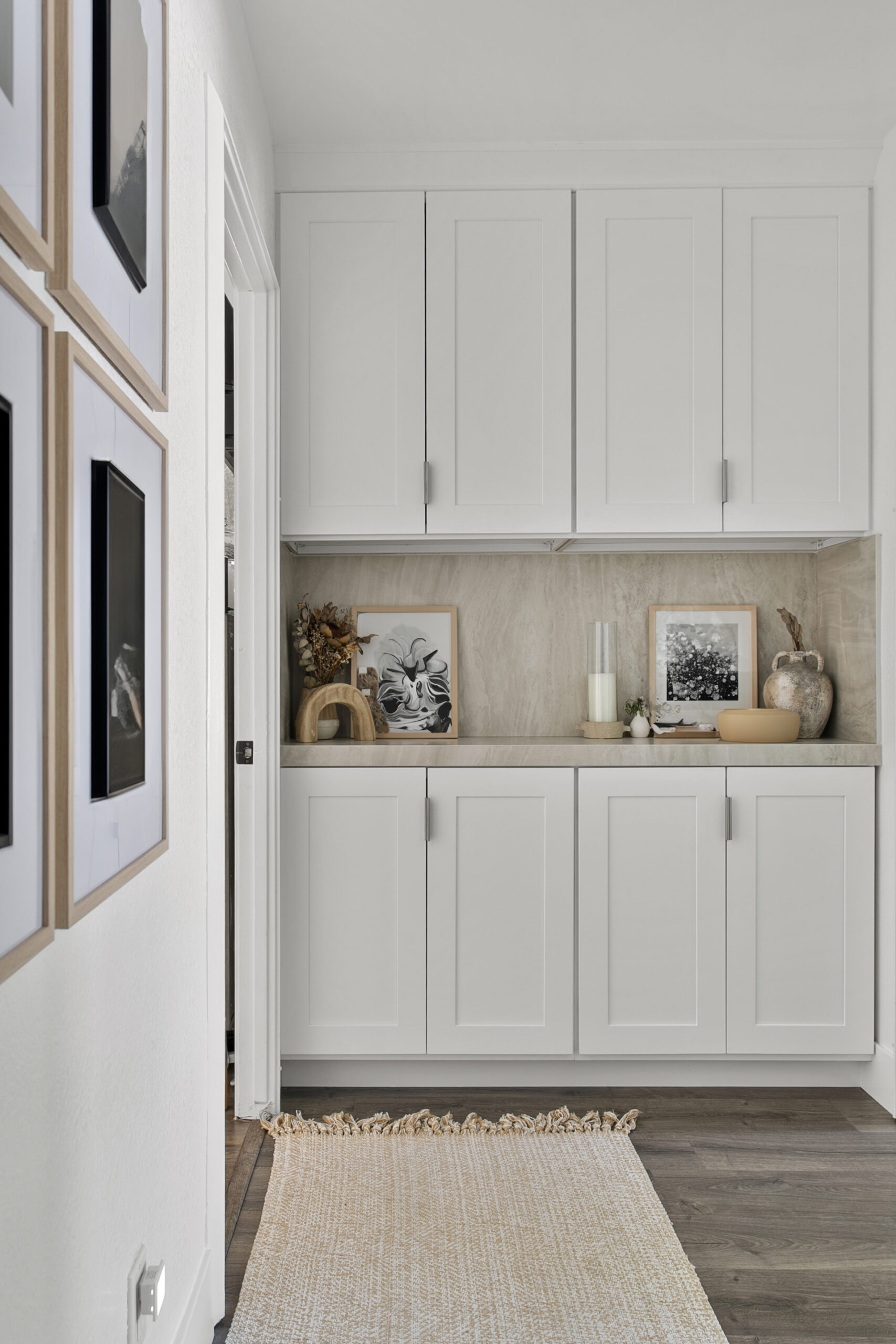This project transforms everyday spaces into serene and functional areas. The laundry room features crisp white cabinetry that maximizes storage, paired with white walls for a clean, bright atmosphere. Neutral, warm-toned flooring enhances comfort and complements the cabinetry’s sleek finish.